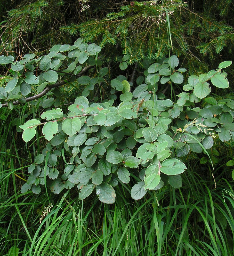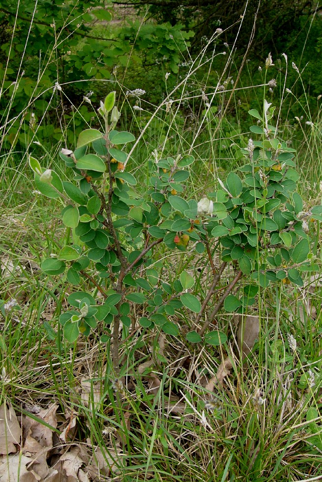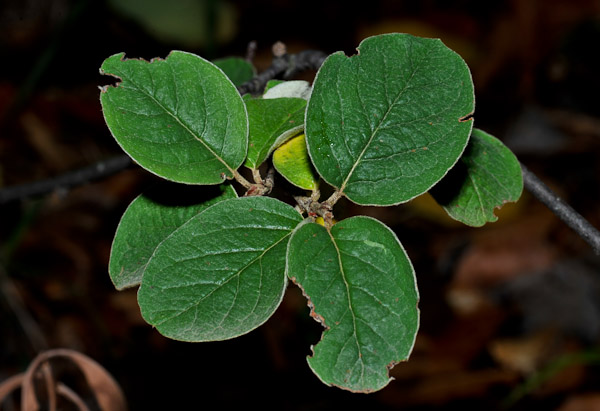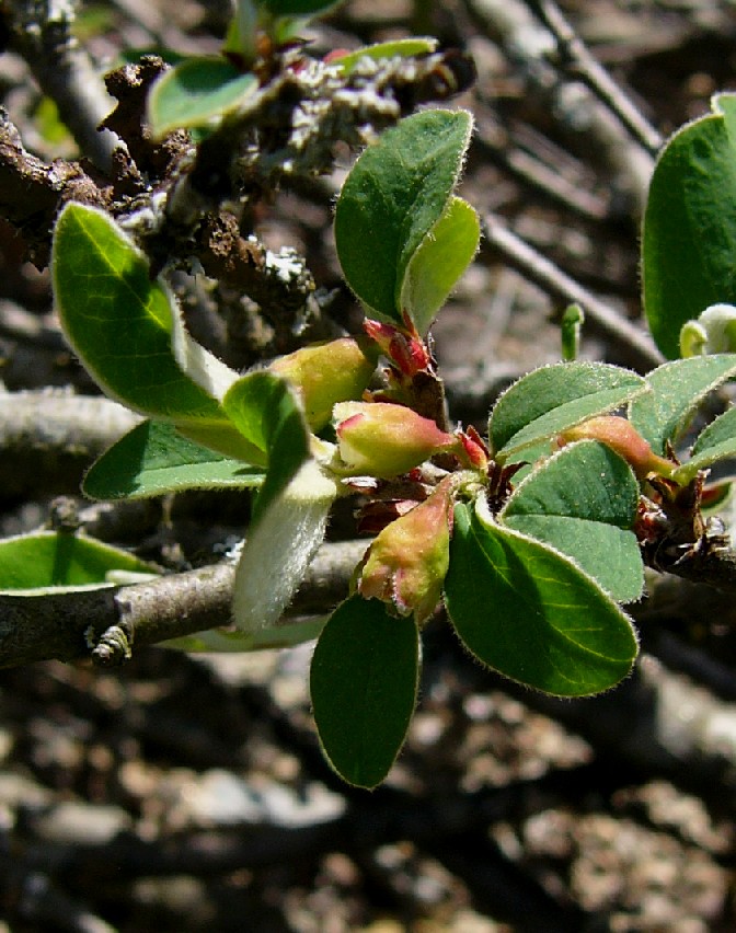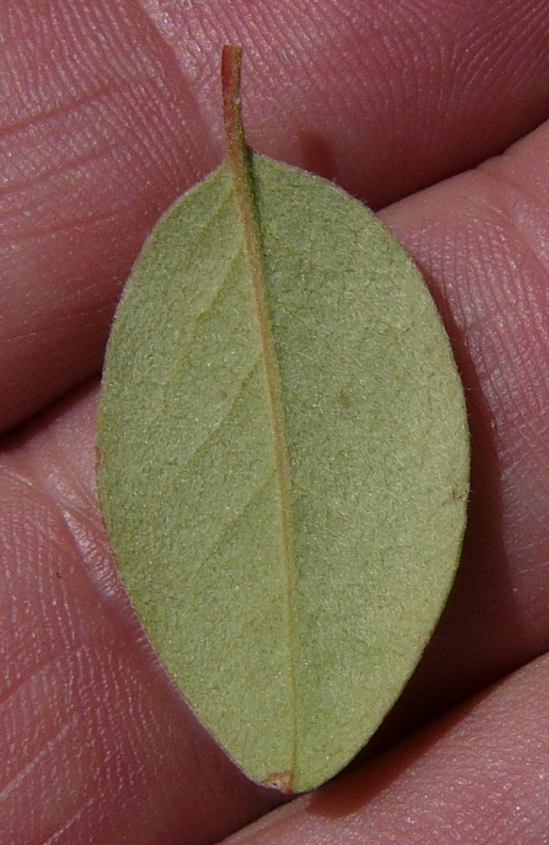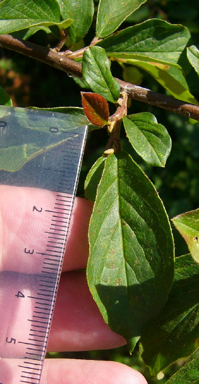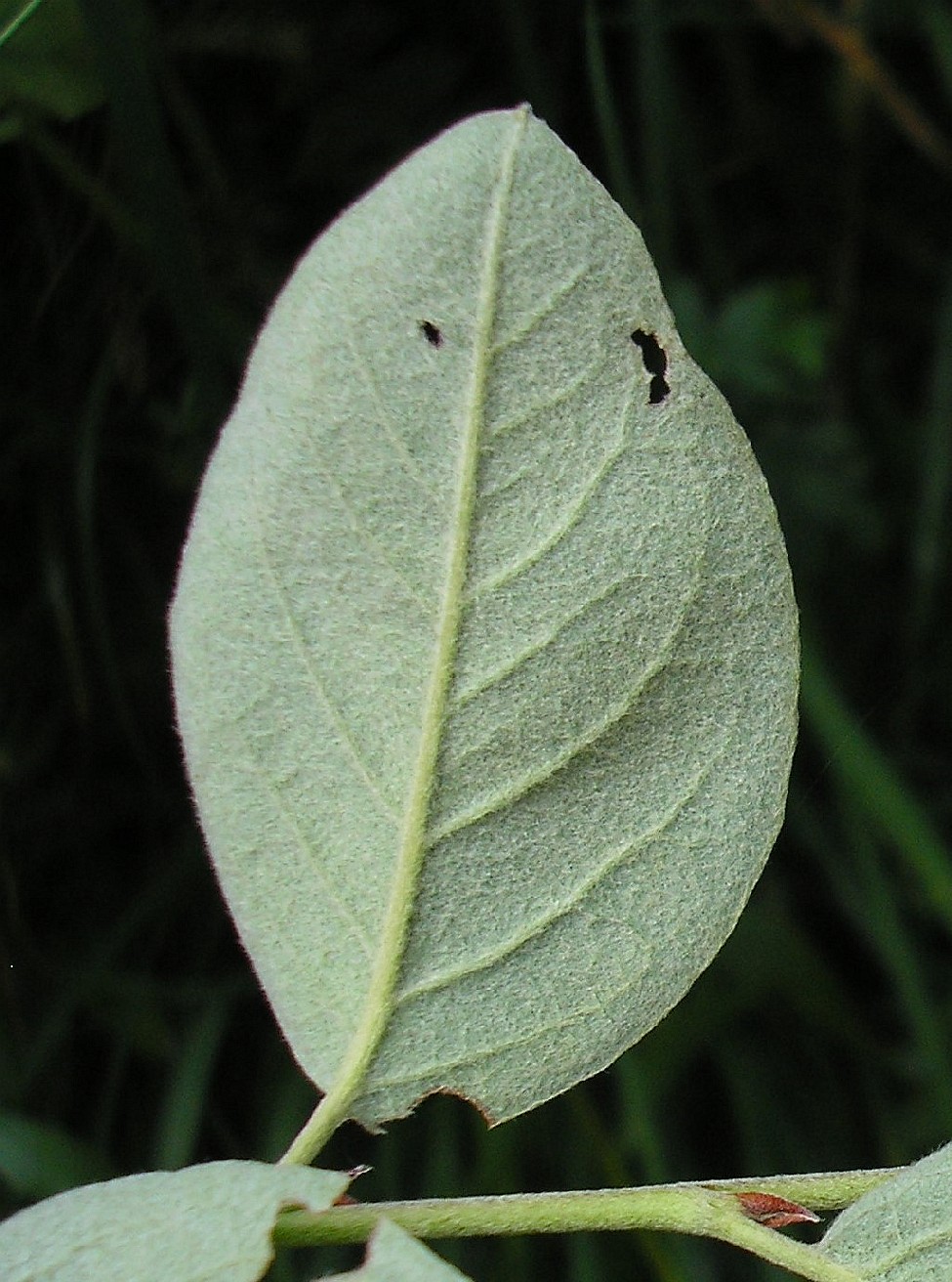 Hypanthium kahl, Blütenstiele etwas weichhaarig, später verkahlend Früchte kugelig, rot, 6 - 8 mm im Durchmesser, kahl Blätter eiförmig 1 - 4 cm lang Blätter stumpf oder ausgerandet oberseits kahl Blattunterseite graufilzig