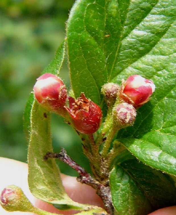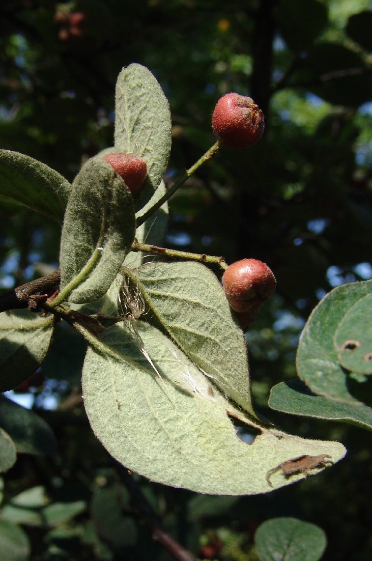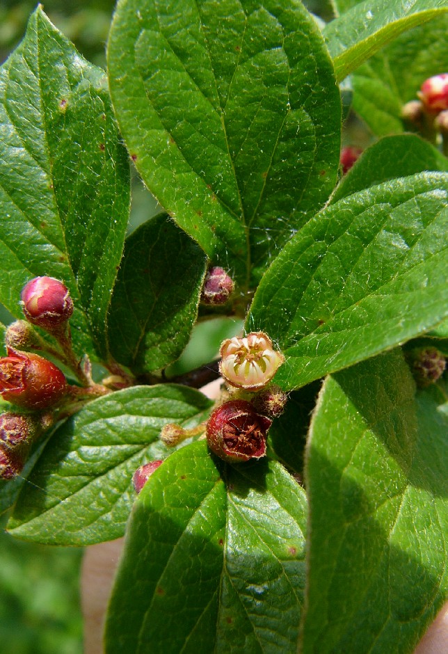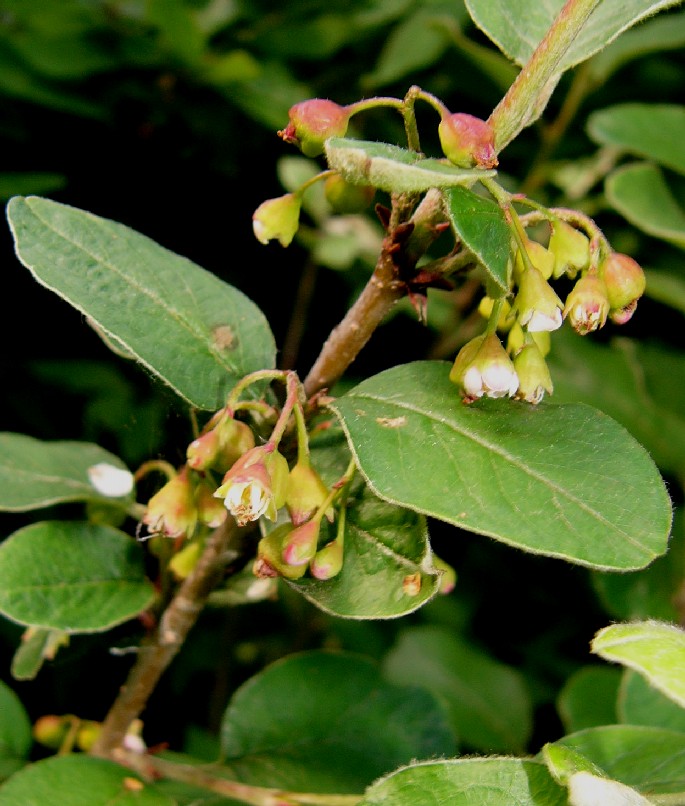 Zwergmispeln - Pflanzen größer 1 m, Blätter 3 - 5 cm groß, stumpf, unterseits filzig, Kronblätter aufrecht