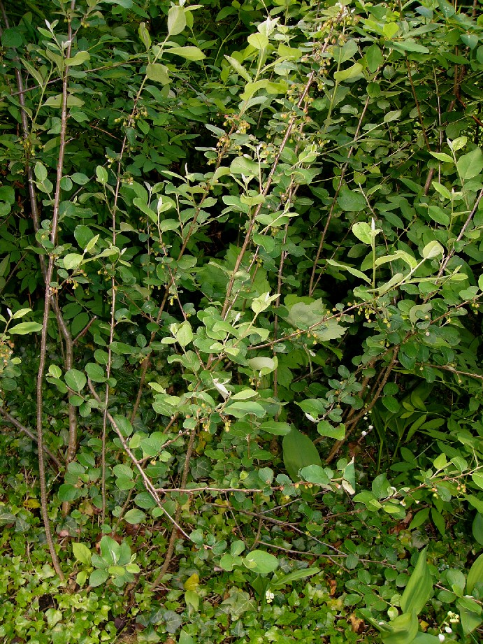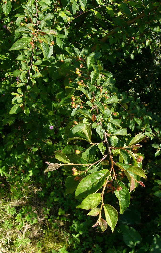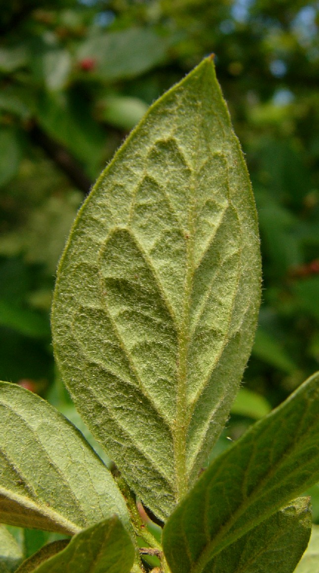Aufrechter, bis 3 m hoher sommergrüner Strauch Blüten zu 12 - 30 in Schirmrispen Früchte kugelig oder birnförmig, 8 - 10 mm im Durchmesser, reif braun, meist mit 4 Steinkernen Blätter eiförmig 3 - 5 cm lang, spitz, oberseits matt glänzend, etwas runzlig Blätter unterseits filzig