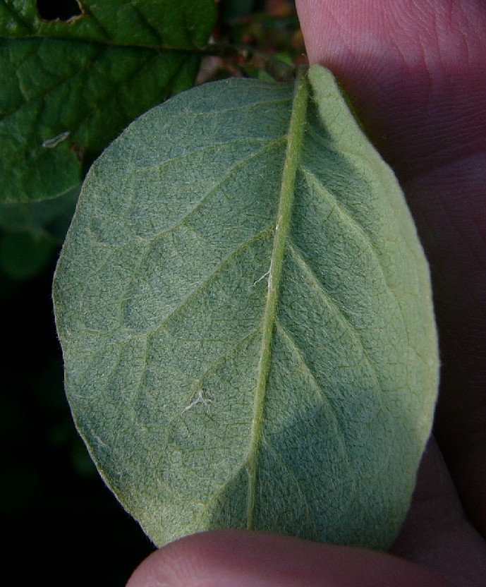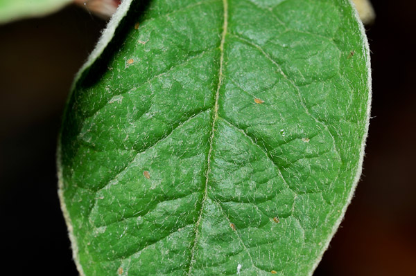 Durchmesser, schwarz, Blätter eiförmig 3 - 5 cm lang, stumpf oder spitz, oberseits stumpf dunkelgrün, unterseits filzig behaart