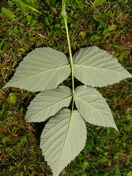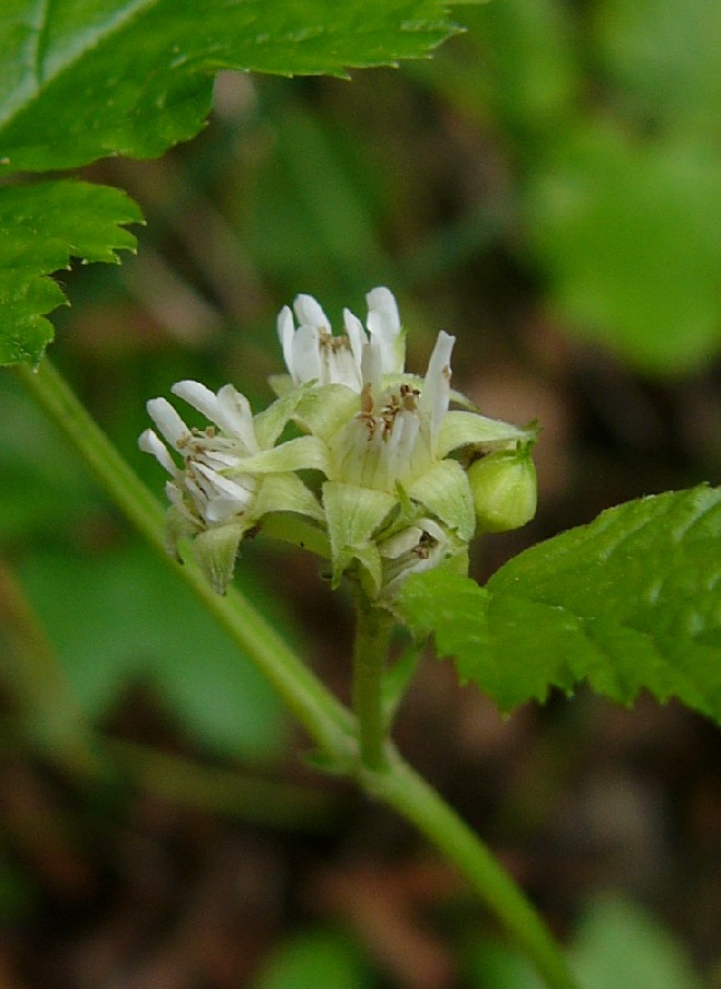 Blütentriebe ca. 30 cm hoch, aus den unterirdischen Pflanzenteilen austreibend Pflanze unterirdisch bis 3 m kriechend Blütentriebe mit mehreren 3- teiligen Blättern Blütenstand doldig, mit 2 - 10 Blüten Kronblätter weiß, schmal, aufrecht Kelchblätter auffälliger, grünlich oder rötlich Frucht glasig- rot Blätter dreizählig gefiedert, Endblättchen kurz gestielt, tief gesägt Blätter meist nur unterseits auf den Blattnerven behaart Nebenblätter breit eiförmig, frei, höchstens mit dem Grund des Blattstiels verwachsen Stängel behaart, mit vereinzelten, weichen, nadeligen Stacheln