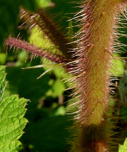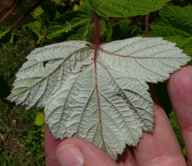 Frucht orange bis rot, glasig Blätter dreizählig selten 5- zählig, mittleres Blättchen meist gelappt und größer als die beiden seitlichen, seitliche Blättchen eiförmig, spitz zulaufend, +/- ungestielt Blätter unterseits dicht weißfilzig Nebenblätter linealisch, 5 - 8 mm lang, behaart Stängel und Blattstiele mit langen rotbraunen oder weinroten Haaren, gestielten Drüsen und dazwischen verstreuten, rötlichen Nadelstacheln