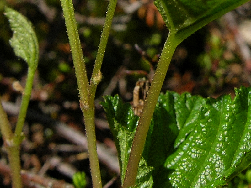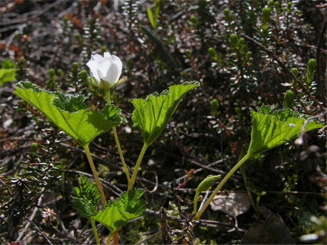 Blätter stumpf 5 - 7- lappig, lang gestielt, Blattspreite gefurcht, oft auch faltig, rundlich-nierenförmig, gezähnt, besonders auf der Unterseite behaart, mit gelben Knoten