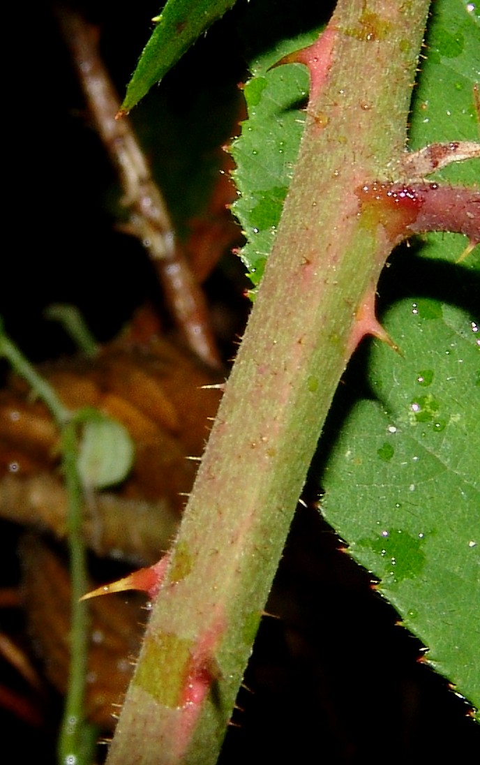 Pflanze 3 - 5 m groß Blütenstand sperrig, Blütenstandsachse abstehend behaart, mit langen pfriemlichen Stacheln Kronblätter blassrosa Blätter meist 3- zählig Endblättchen mit schwach abgesetzter Spitze, fast kreisrund, mit herzförmigem Grund, Seitenblättchen 3-zähliger Blättchen am Grund herzförmig, 1,5 - 2 mm tief gesägt Blätter oberseits deutlich behaart, Schössling dicht behaart, Stacheln 4 - 6 mm lang mit zahlreichen mehr als 0,5 mm langen Stieldrüsen