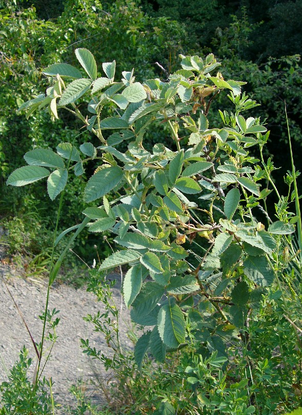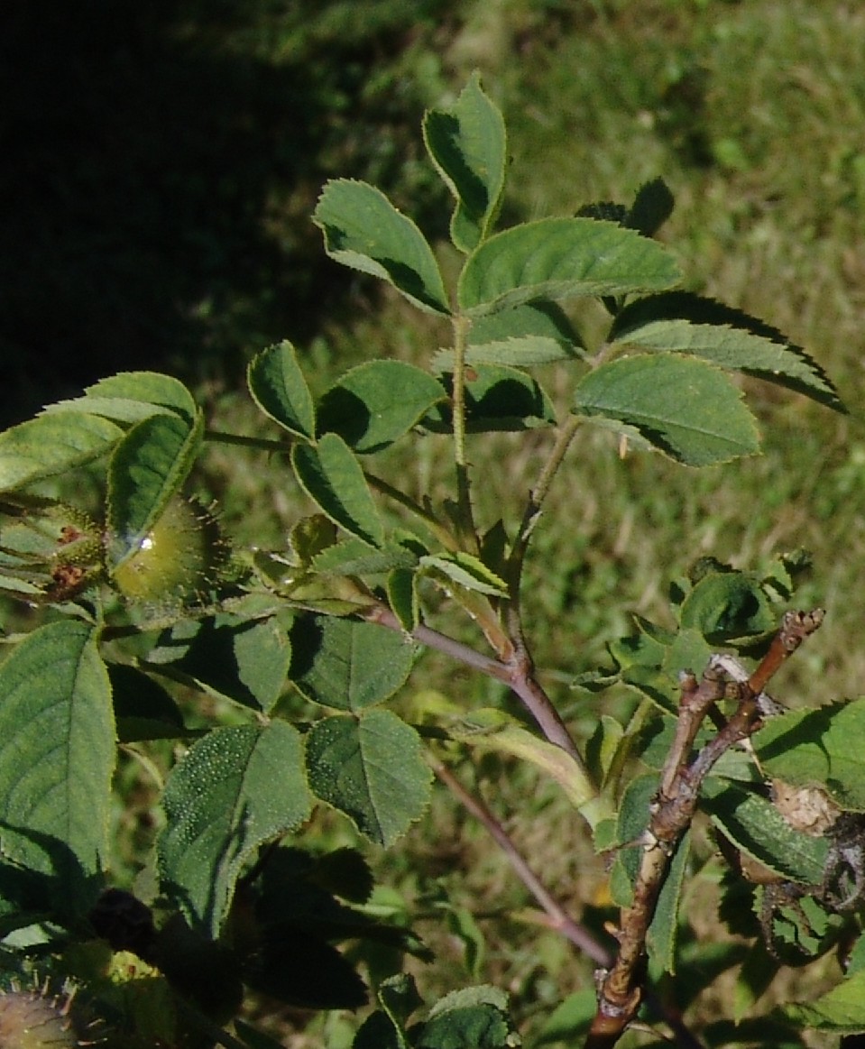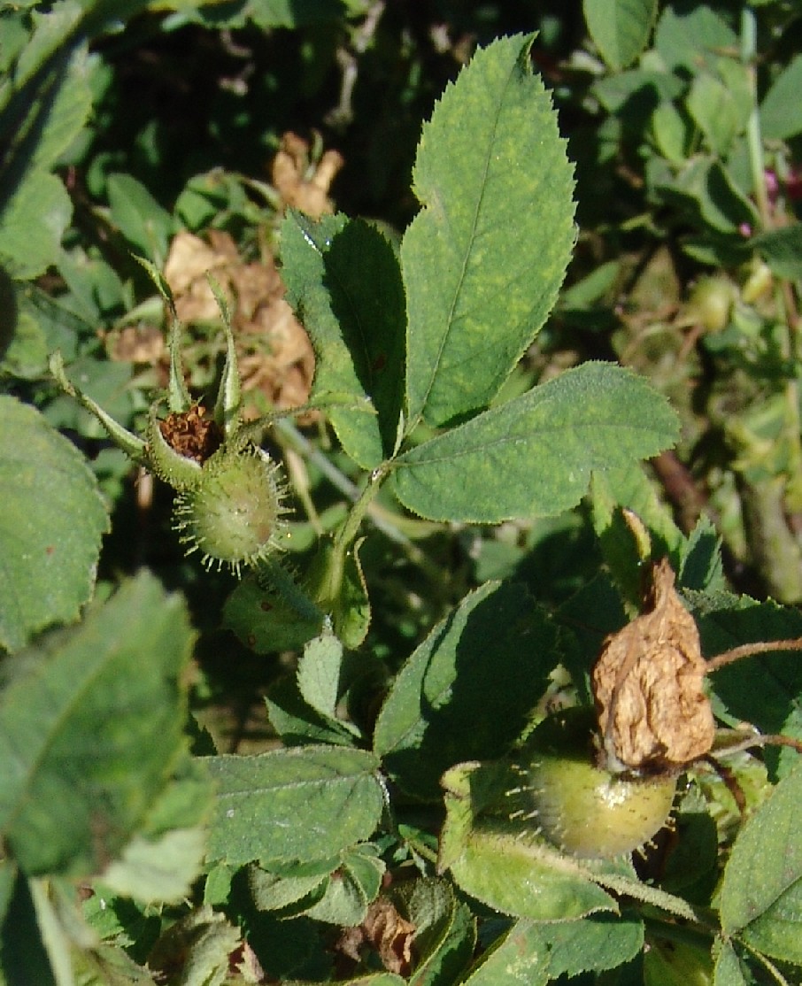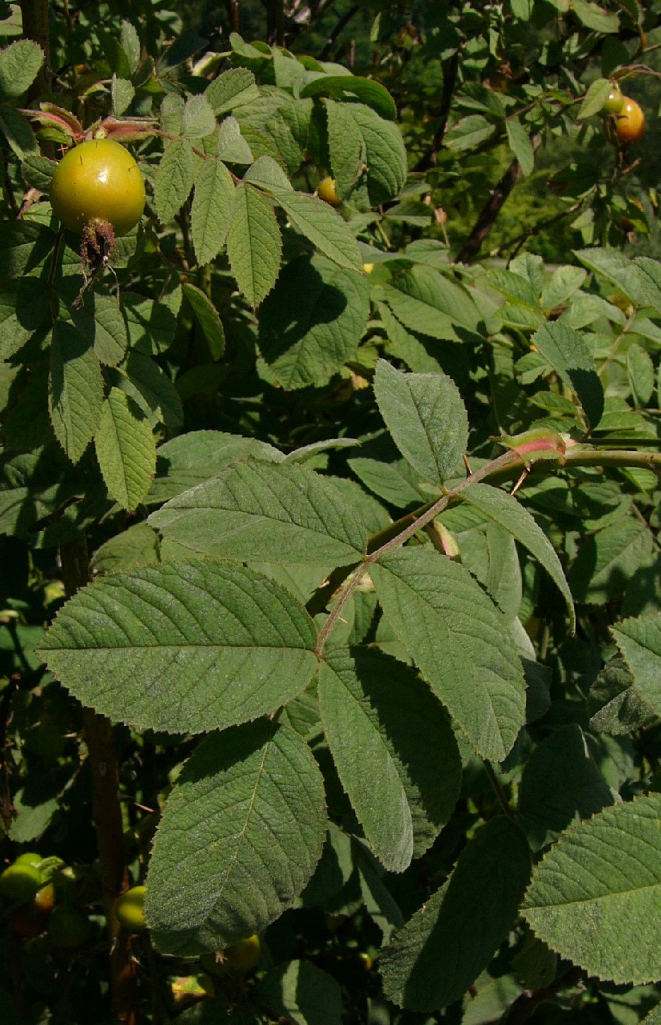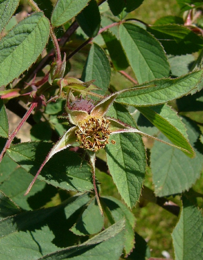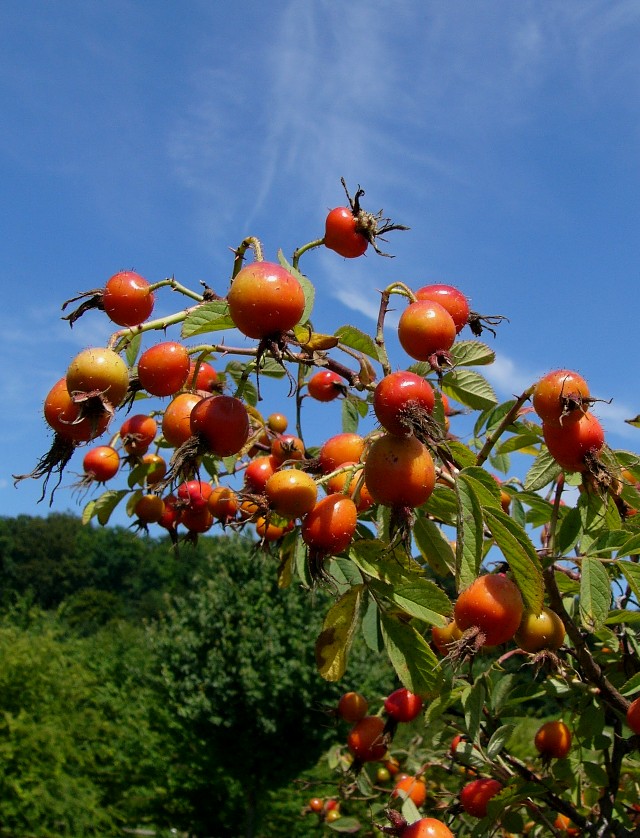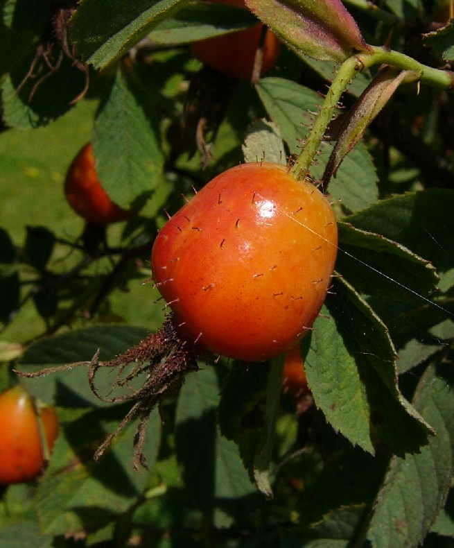 Reife Hagebutten rot, sehr groß (bis 4 cm), essbar (Name!), nach der Reife herabhängend, Kelchblätter haftend