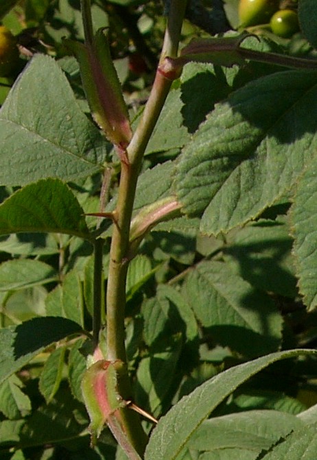 Stacheln gleichartig, mit 1 bis 4 Millimeter langer Ansatzfläche, gerade. Lediglich an den oberen Zweigen sind sie manchmal ungleich und teilweise auch nadel- oder borstenförmig