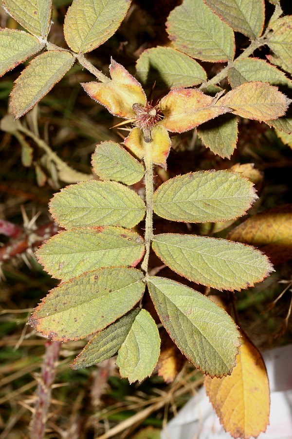 Blütenstiel und Butte dicht mit Stieldrüsen und Stachelborsten besetzt, Stiel kürzer als die Butte, Kelchblätter zur Fruchtzeit steil aufgerichtet