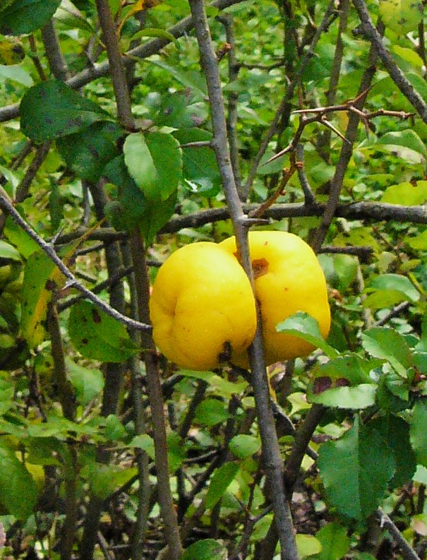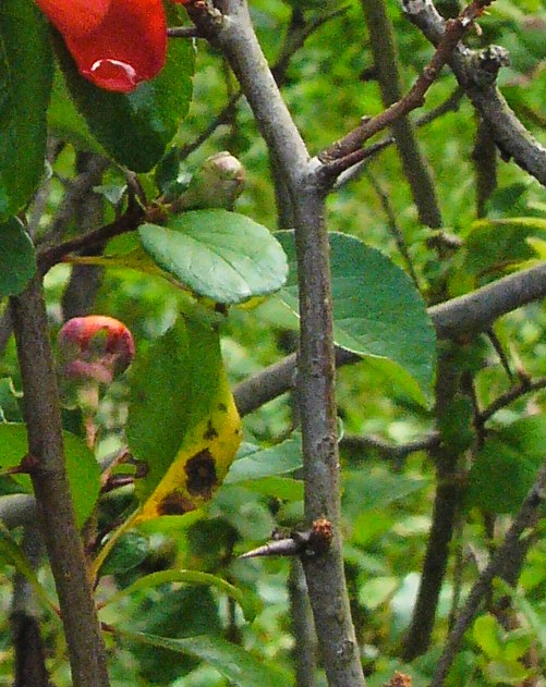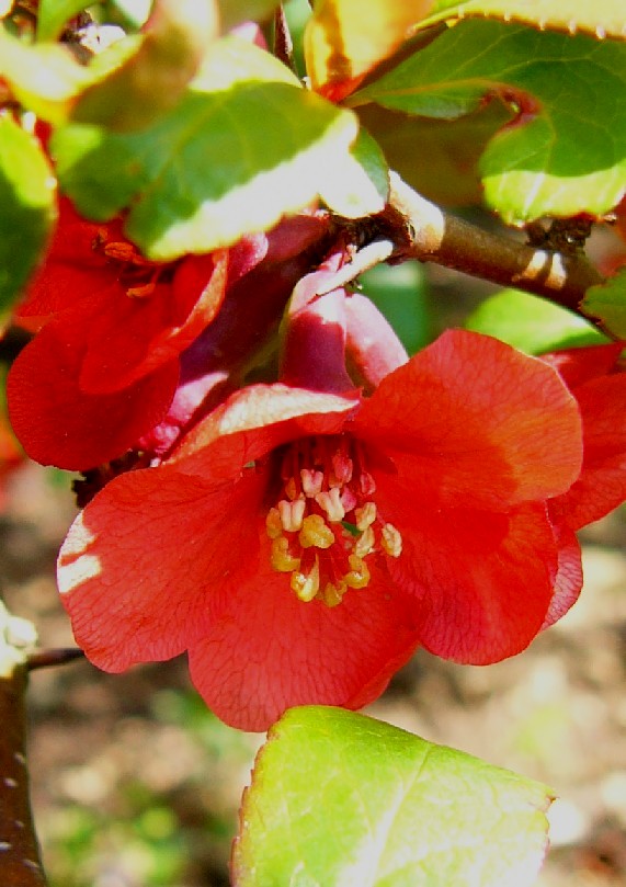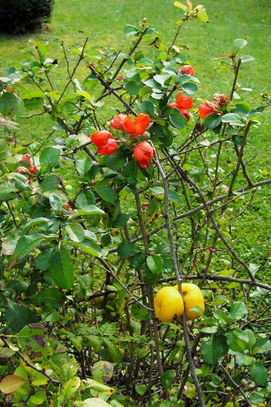 1 - 2 m hoher sommergrüner Strauch Blüten einzeln oder zu mehreren in Büscheln Blüten rot oder orange Früchte = 3 - 15 cm lange, +/- rundlich , wohlriechende Apfelfrucht, mit 5- fächerigem Kernhaus Blätter sommergrün, gekerbt oder gesägt Nebenblätter der Langtriebblätter groß, eirundlich Äste mit einteiligen Dornen