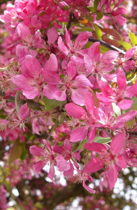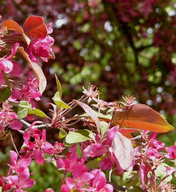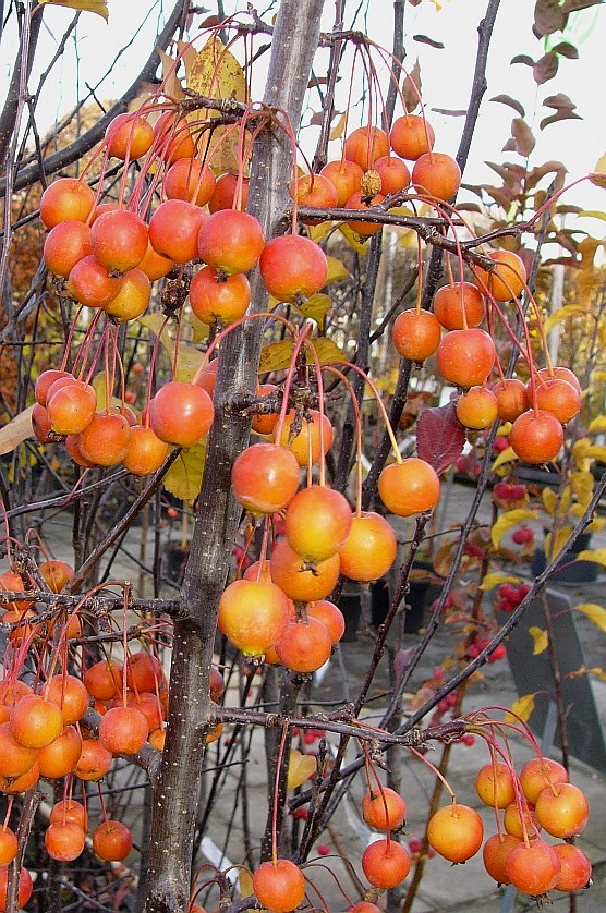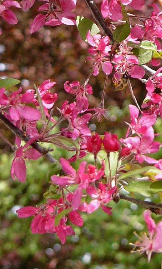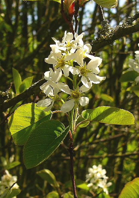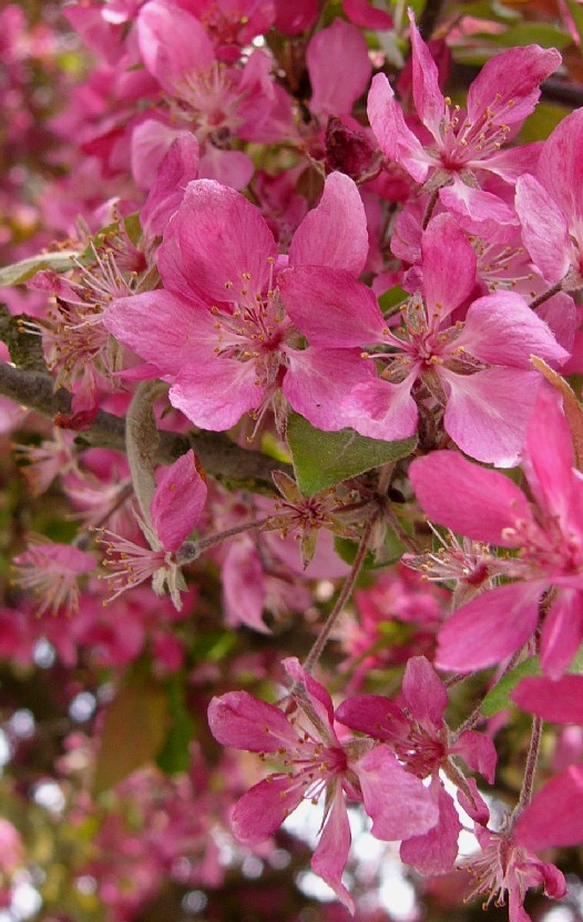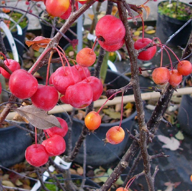 2 - 15 m hohe Bäume Blüten zu 3 - 8 in Doldentrauben am Ende von Kurztrieben Blüten rot Früchte 1,5 - 2,5 cm, rundlich, essbar, rot