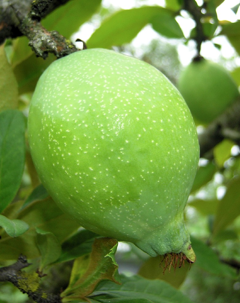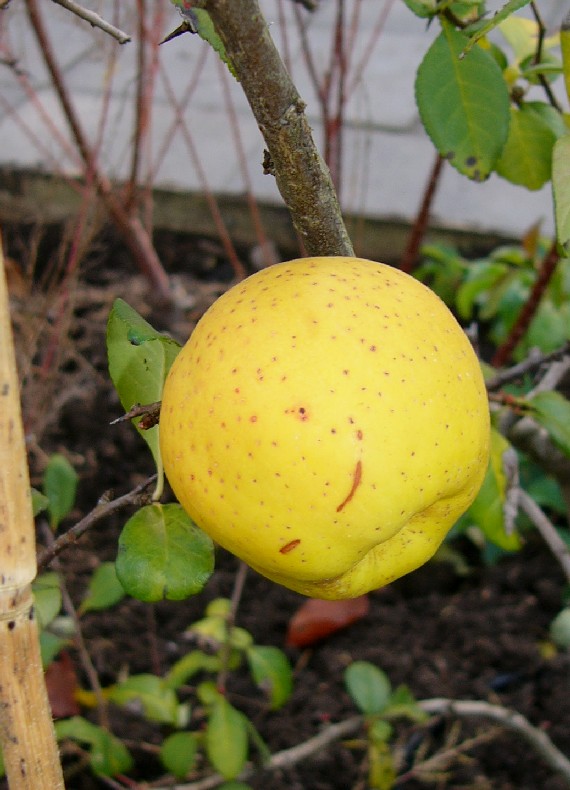 Bis 1 m hoher sommergrüner Strauch Blüten ziegelrot, 5 Griffel, viele Staubblätter Hüllblätter stumpf Reife Frucht gelblich, 3 - 4 cm im Durchmesser, Blätter eiförmig, vorne abgerundet Triebe behaart Blätter unterseits glänzend