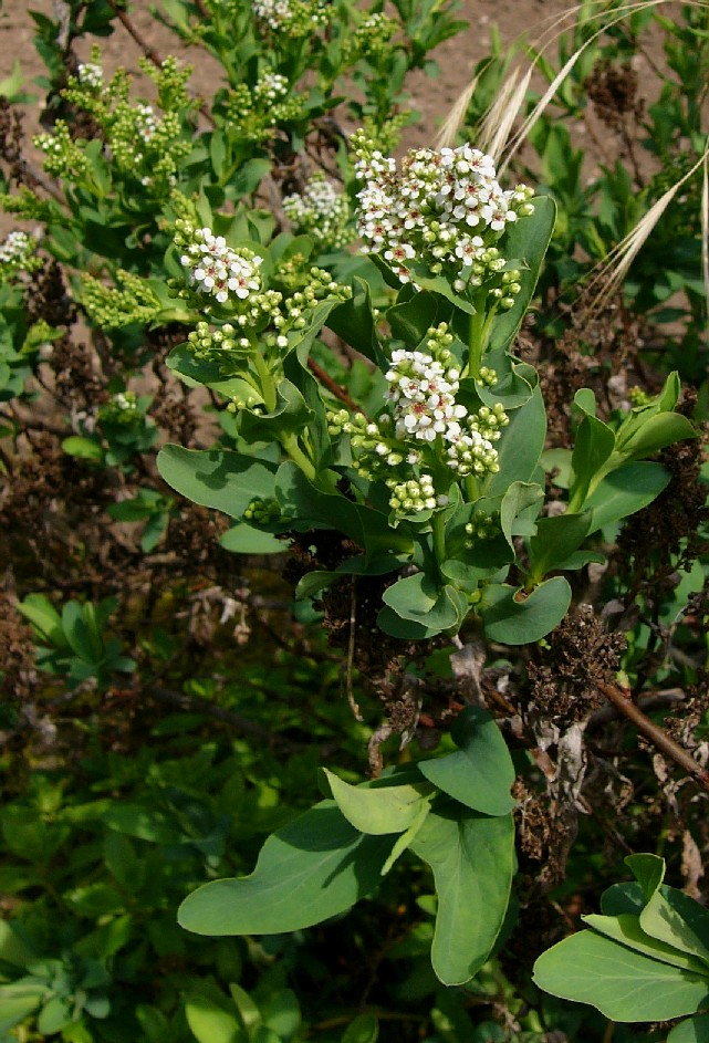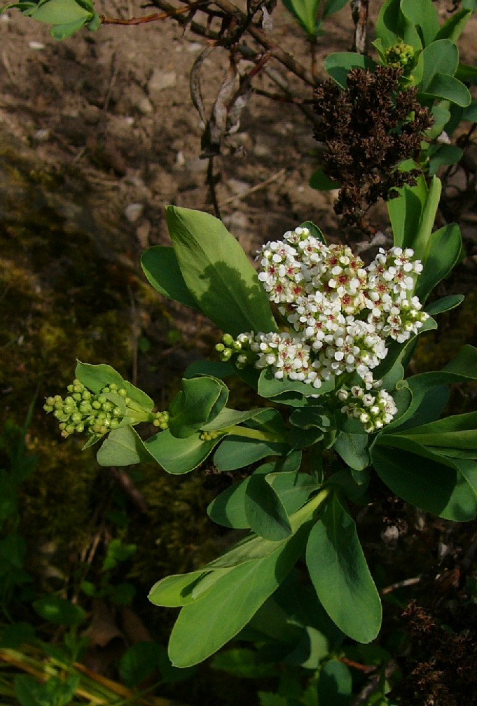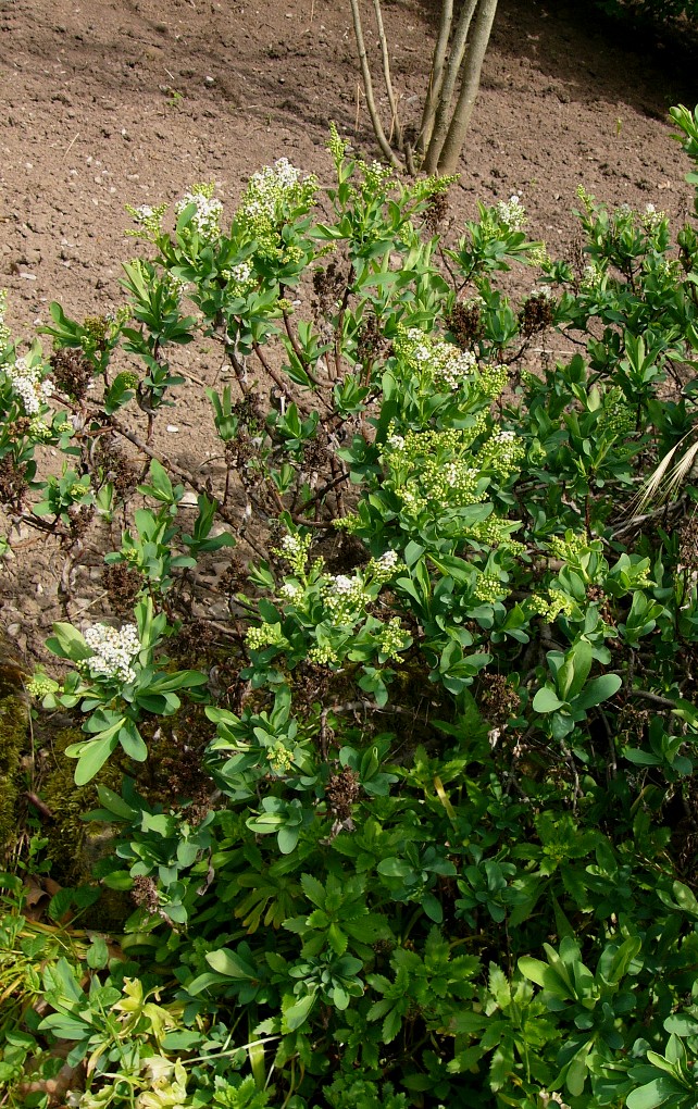 0,5 - 1 m hohe, dornenlose, sommergrüne Sträucher Blüten in 8 - 12 cm langen, vielblütigen, Blüten weiß, mit 5 Kronblättern, Früchte = 4 mm lange Balgfrüchte, zur Hälfte im ca. 2mm langen Blütenbecher geborgen Blätter 5 - 15 cm lang, auffallend blaugrün,