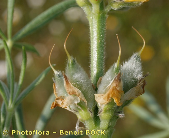 Blüten gelb, Fahne 15 - 18 mm lang, 10 - 11 mm breit, Flügel 14 - 17 mm lang, 8 - 9 mm lang, das Schiffchen meist verdeckend, Schiffchen 14 - 15 mm lang, 4 - 6 mm breit, kahl