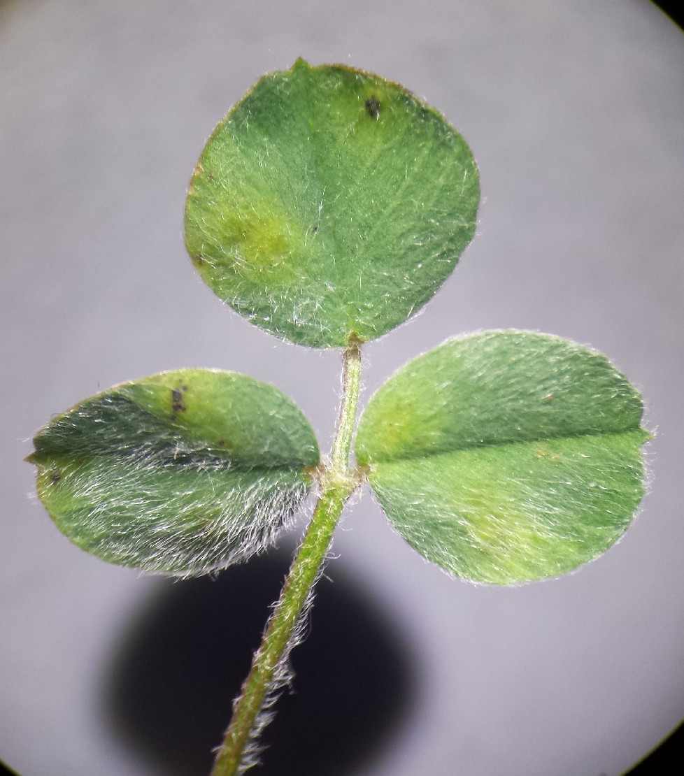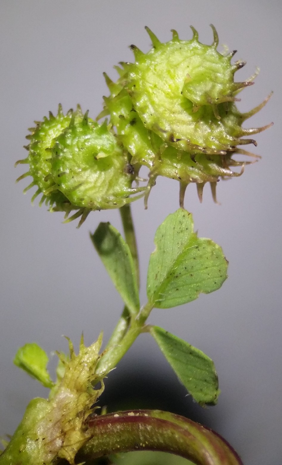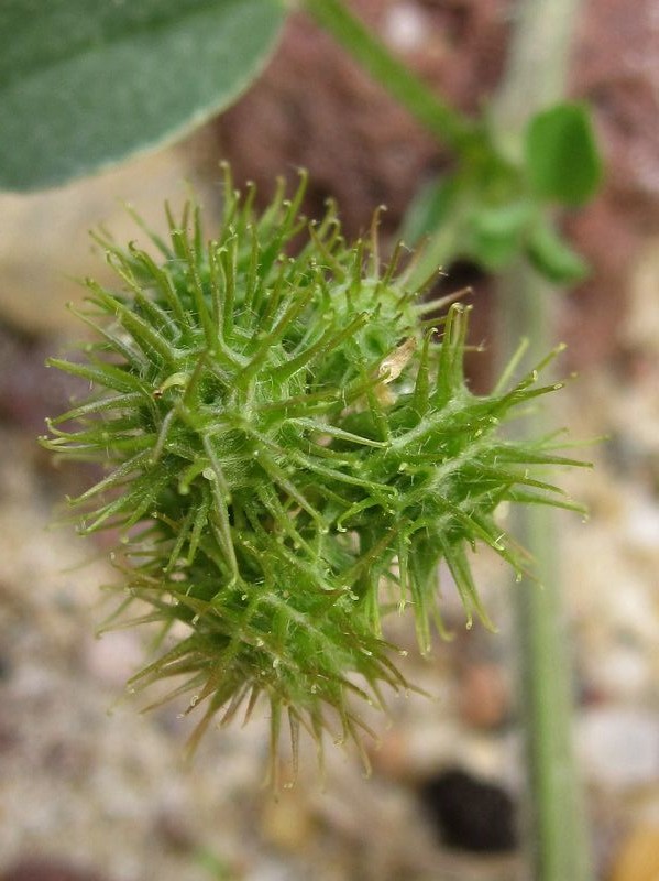 groß, Hülsen 5 - 6 mm im Durchmesser, mit verflochtenen Stacheln Nebenblätter eiförmig, gezähnt Stängel abstehend behaart Blätter 3- teilig, gestielt, Blättchen 10 - 27 mm lang, 7 - 43 mm breit, vorne ausgerandet, mit Spitzchen, am Grund keilförmig, meist purpur- schwarz gefleckt, oft breiter als lang Blattunterseite etwas behaart, ohne Flecken