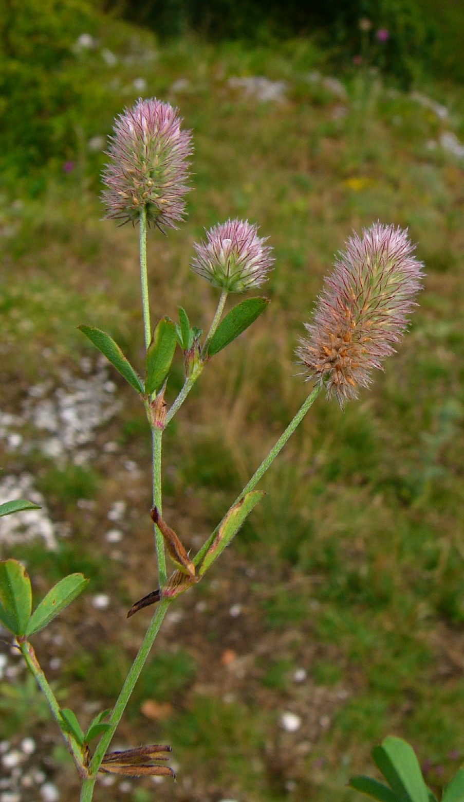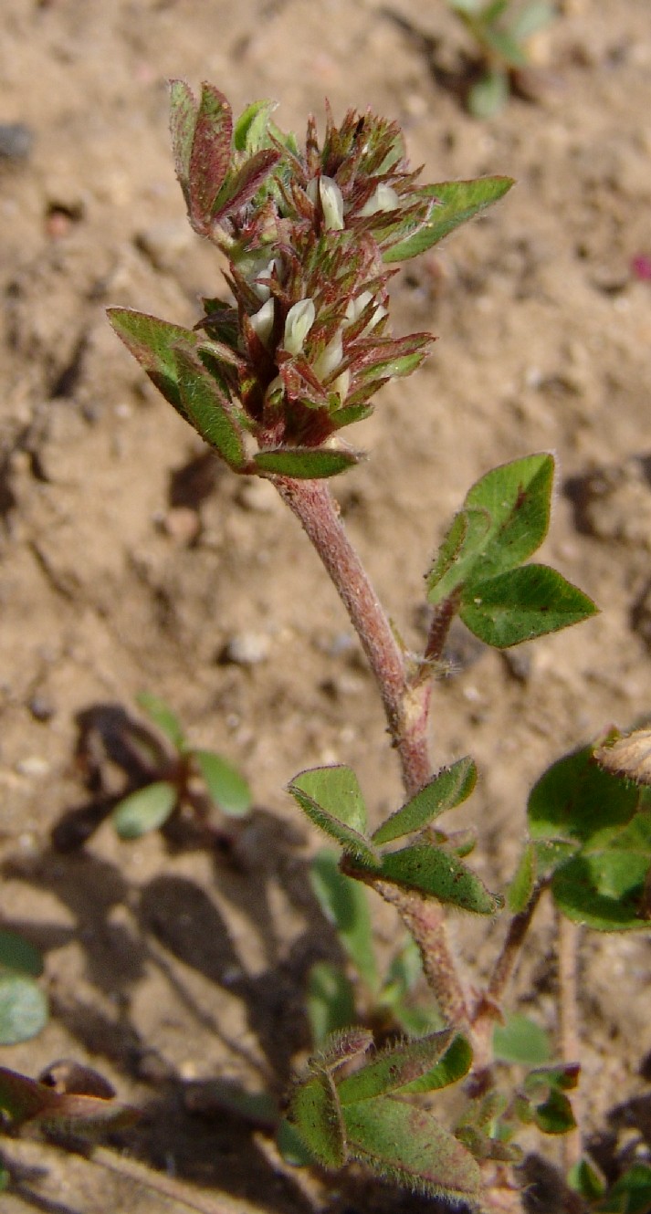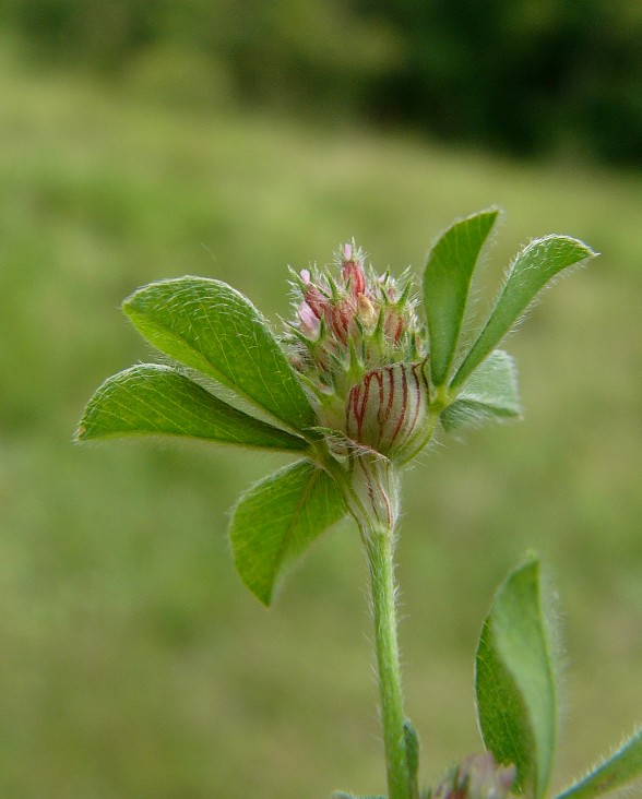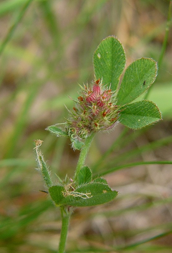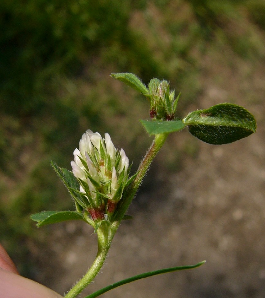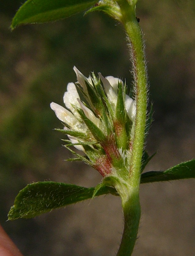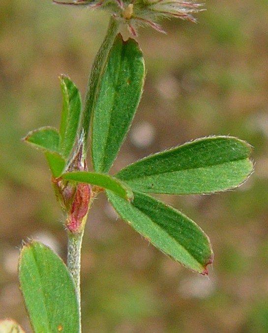 Pflanze 8 - 30 cm oft in großen Trupps Blütenstand eiförmig , ca. 1 cm dick, gestielt, ohne umhüllende Blätter Kelch rötlich, federartig bewimpert, deutlich länger als die weißliche, später rötliche Krone Früchte ca. 1,5 mm lang, mit 1 - 2 Samen Blätter 3- teilig gefingert, graugrün Blättchen schmal lanzettlich Blätter und Stängel stark behaart