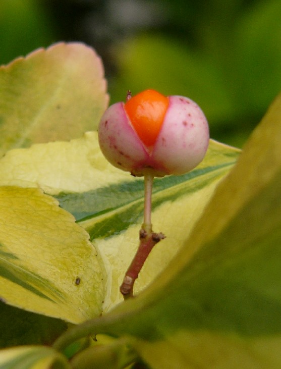 Früchte rundlich, rosa, Samenmantel (= Arillus) orangerot, Samen weiß