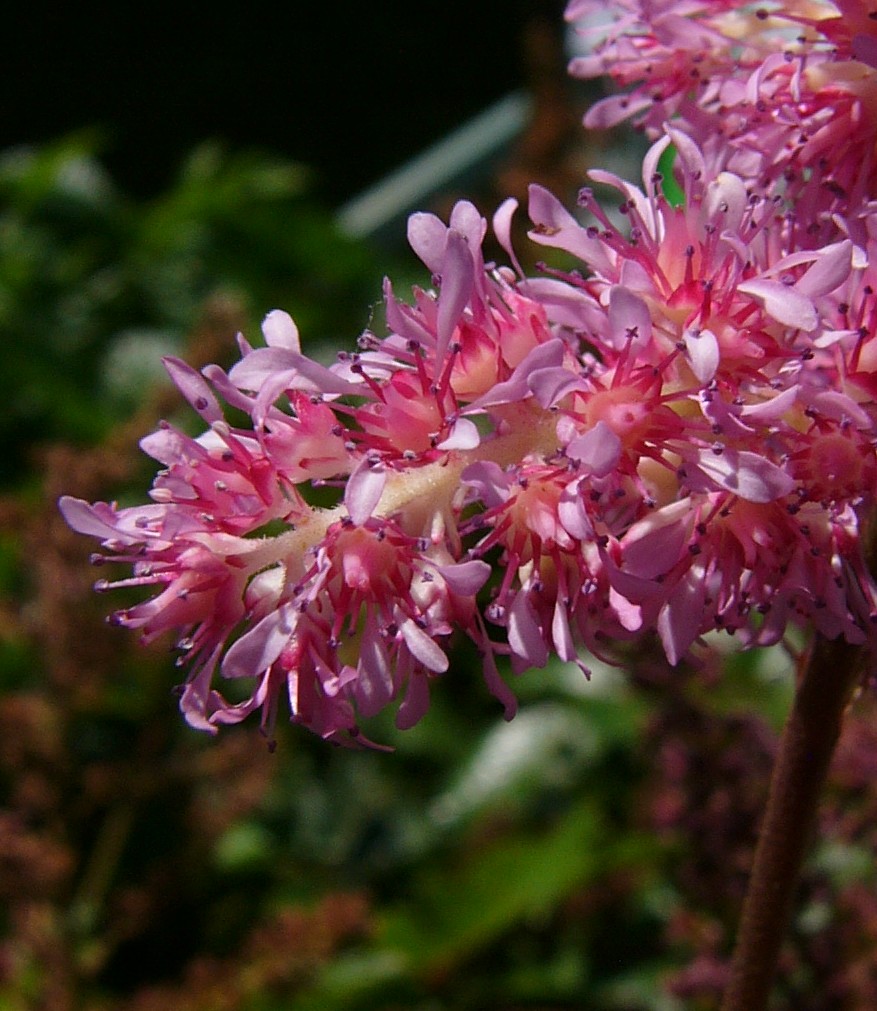 Pflanzen 40 - 100 cm groß Blüten in vielblütigen, kerzenförmigen Rispen Blütenstandsäste mit langen hellbraunen Haaren Blüten mit 5 rosafarbenen, linealischen Kronblätter, Kelch kahl Blätter 2 - 3- fach gefiedert,