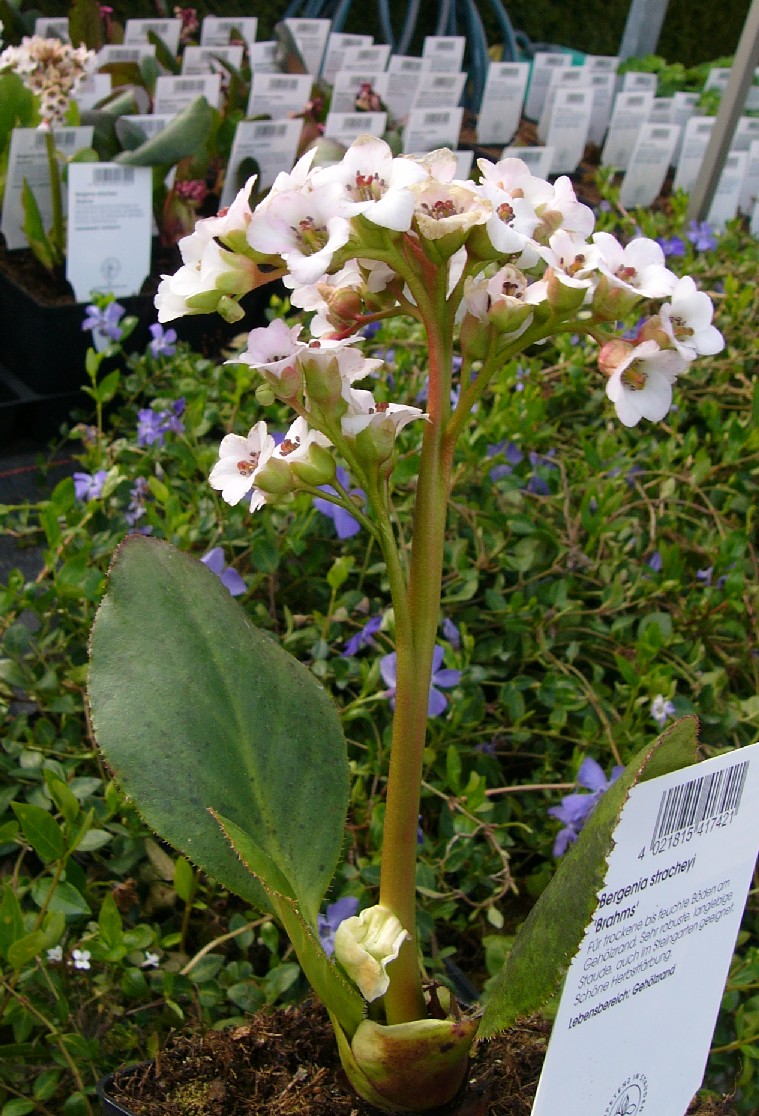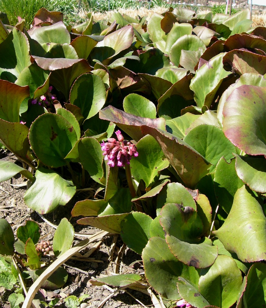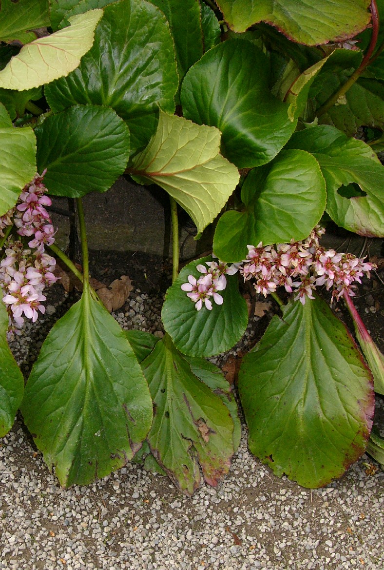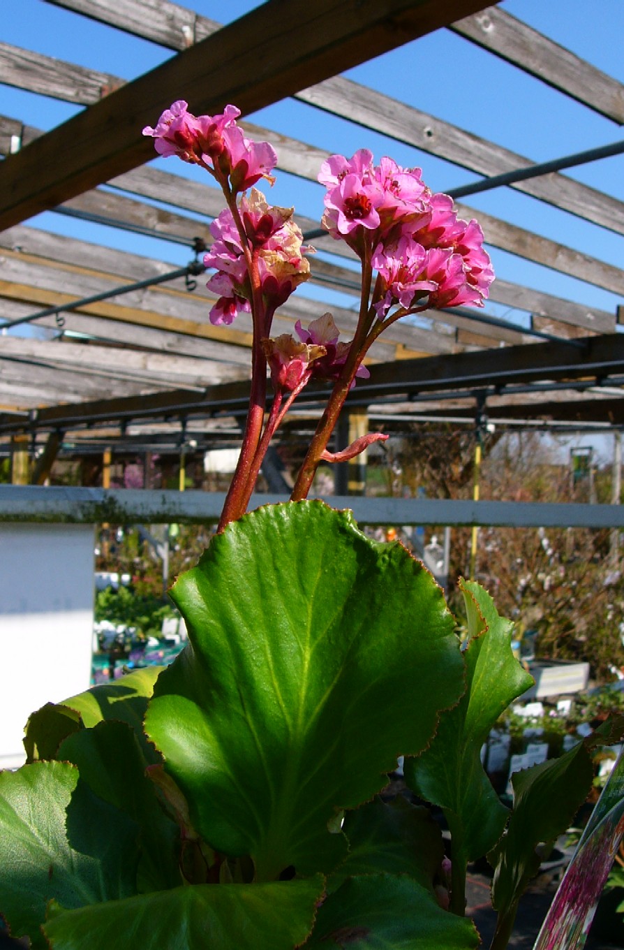 Zierpflanzen meist Hybriden z. B. Bergenia ciliata × crassifolia, Bergenia