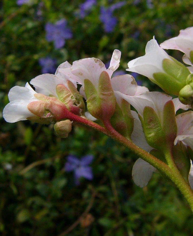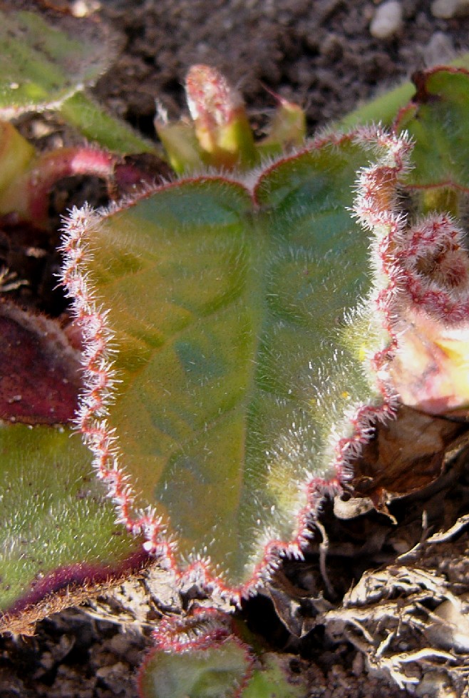 Pflanze 30 - 40 cm groß Blüten rosa Blütenschaft, Blütenstandsäste und Kelchblätter hellrot, spärlich drüsig Blätter kreisrund, am Grund herzförmig Blattspreitenrand mit kurzen, stumpfen oder mit längeren Wimpern