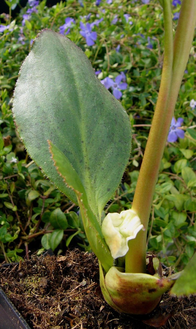 Pflanze 30 - 40 cm groß bildet lange fleischige Rhizome Blüten rosa, später rötlich, niemals weiß Blütenschaft, Blütenstandsäste und Kelchblätter