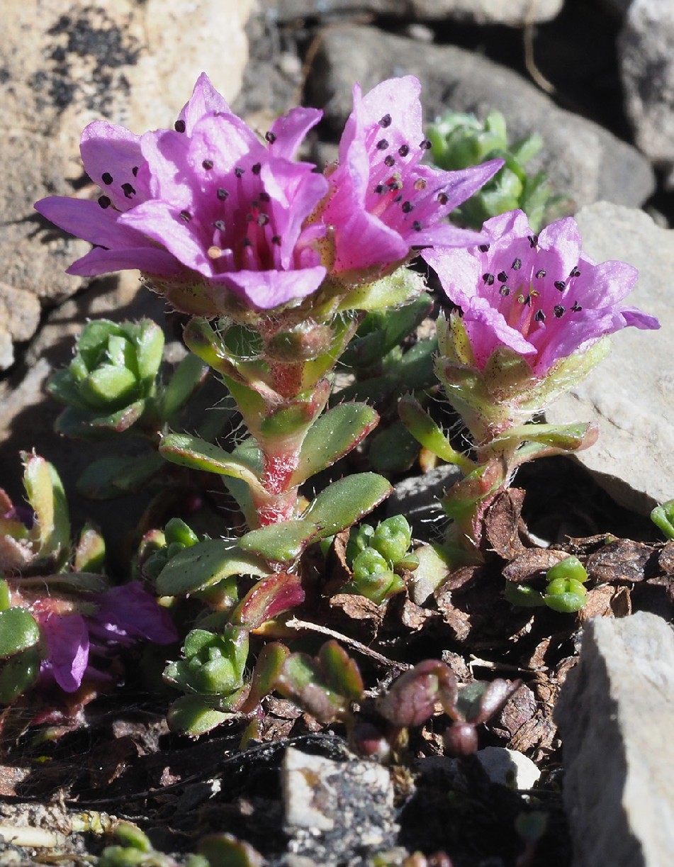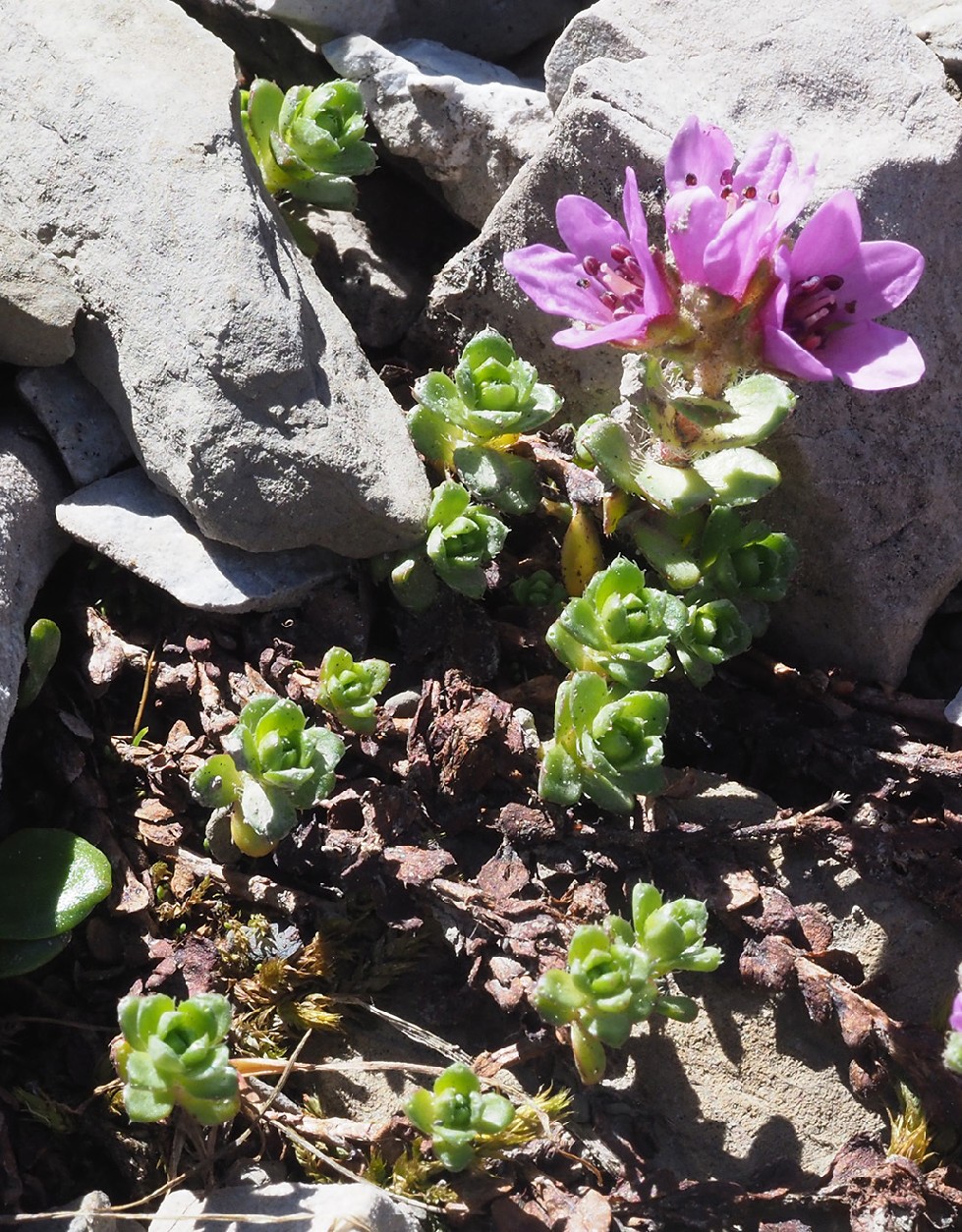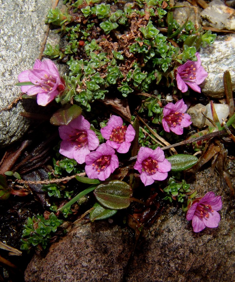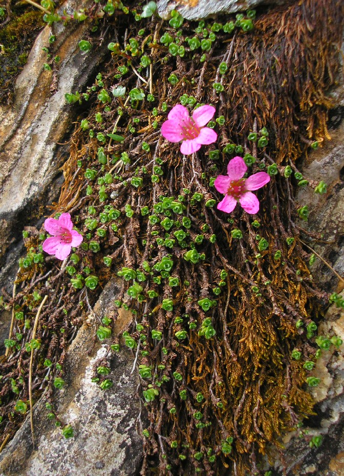 VII - VIII, Hochalpine Steinschuttfluren (2100 - 3000 m) Hybride Saxifraga oppositifolia x Saxifraga biflora Synonyme: English name: Nom francais: Nome italiano: Verbreitung in Deutschland: Gefährdung in Deutschland: Weltweite Verbreitung: Etymologie: