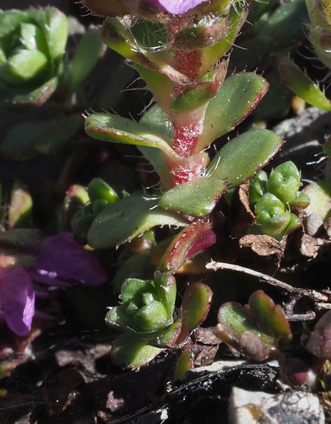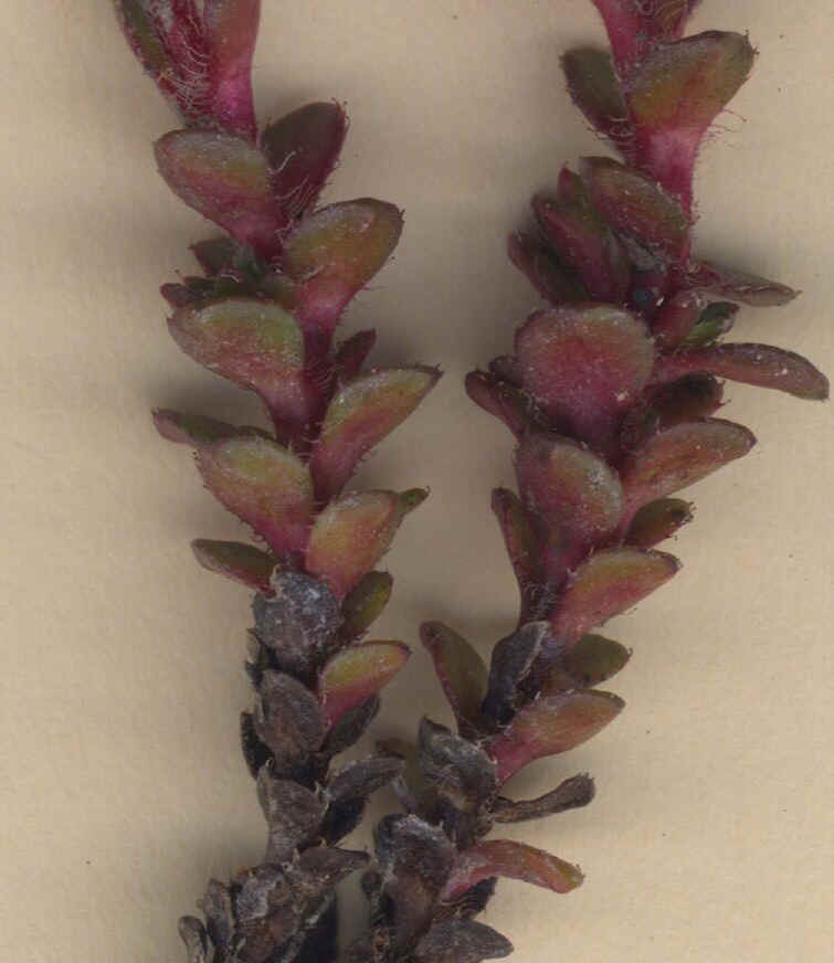 Blätter gegenständig, eiförmig lanzettlich bis rundlich, 5 - 9 mm lang, bewimpert