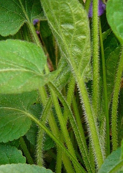 Zumindest bei einigen Blättern sind Blattunterseite, Blüten- und Blattstiele abstehend behaart