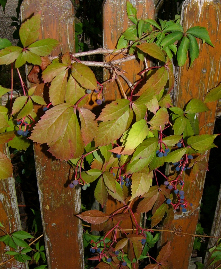 Trauben klein (ca. 8 mm), dunkelblauviolett Blätter 5-zählig gefingert Zweige verholzt, Rinde älterer Zweige nicht längsfaserig Ranken mit Haftscheiben, die Bauschäden verursachen können