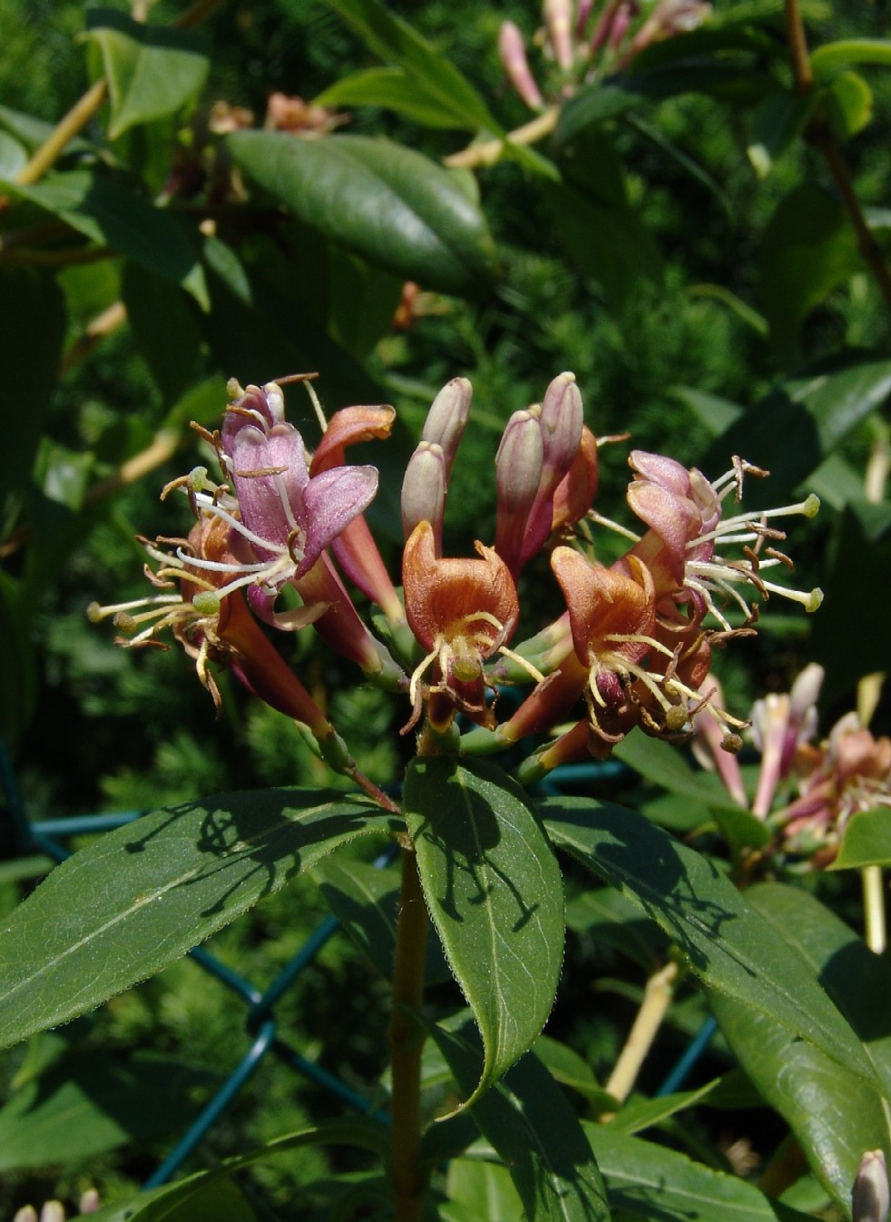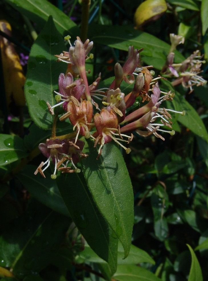 Blüten creme-purpur, paarweise, jedoch am Triebende gehäuft, im Verblühen bräunlich orange oder orangerot, Oberlippe oft zurückgebogem, Unterlippe schmal, Hochblätter nicht verwachsen