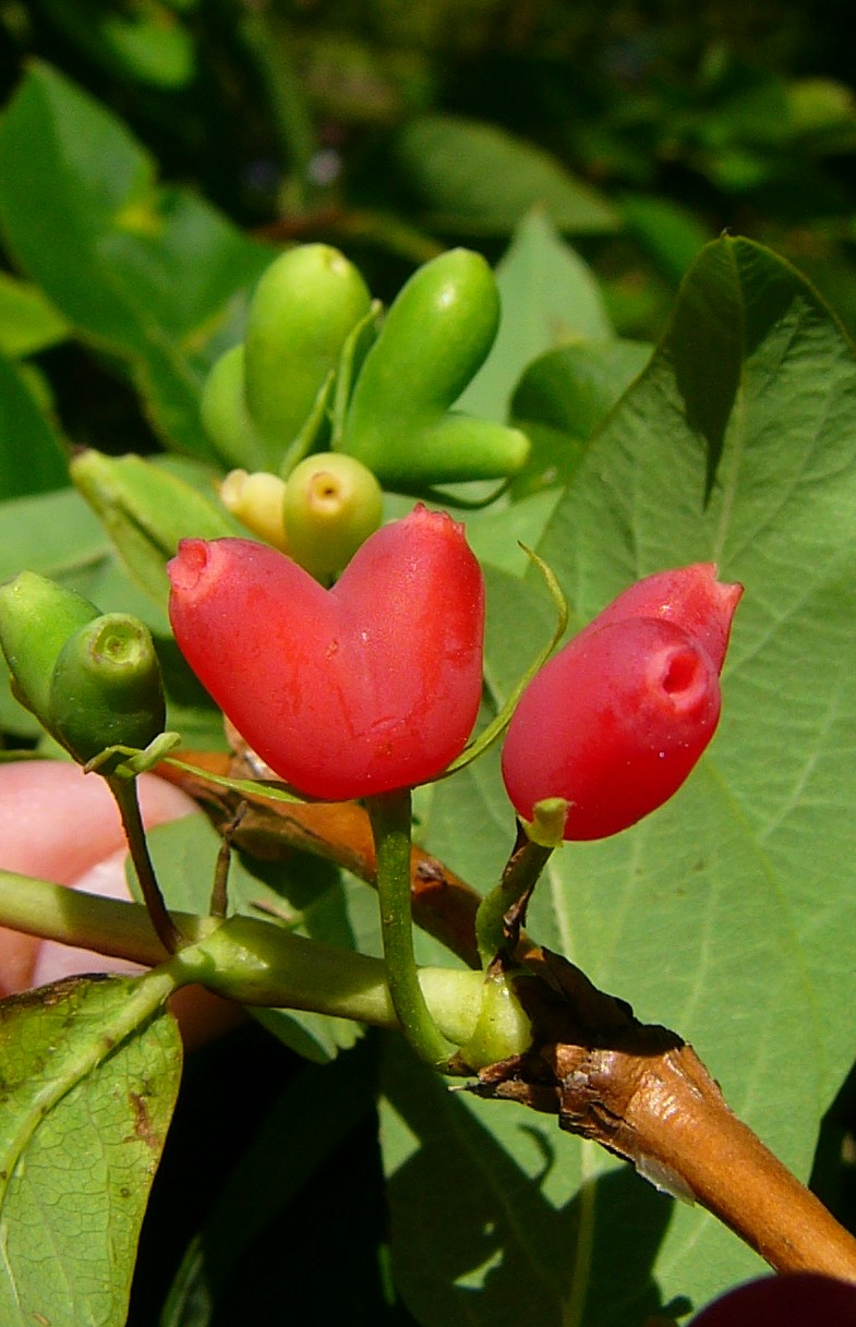 Doppelfrucht nur z.T. verwachsen, Einzelfrucht kugelig, 4 mm im Durchmesser, rot