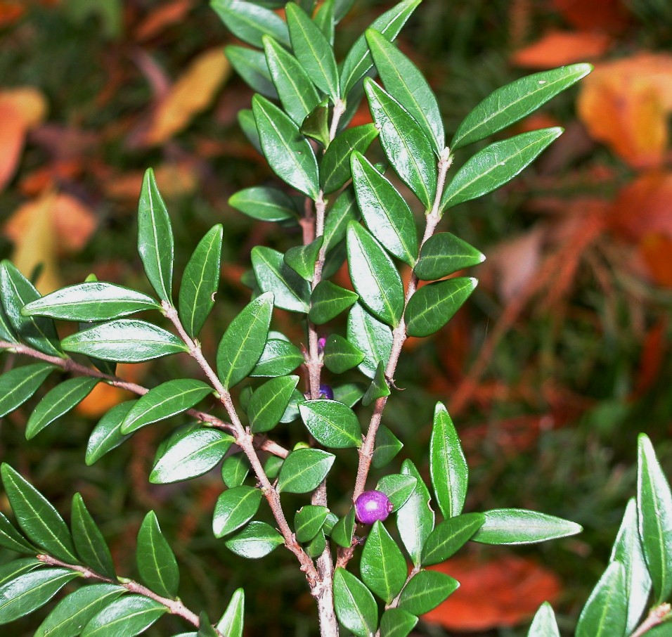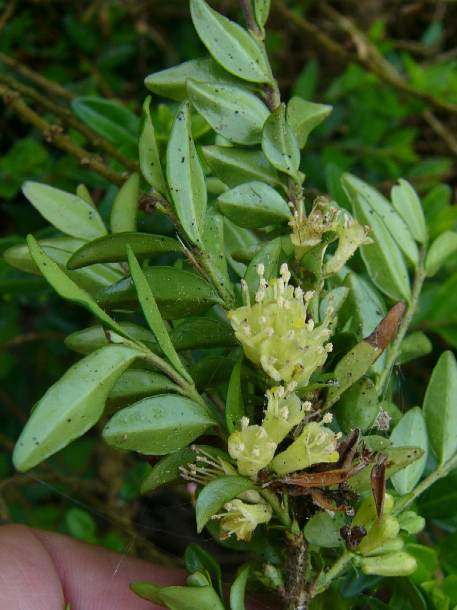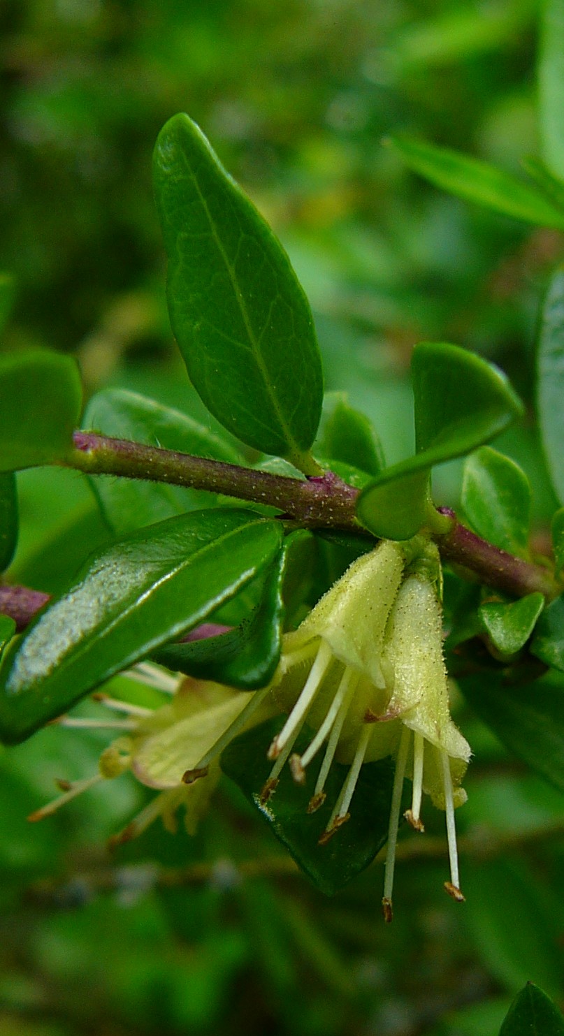 Tragblätter pfriemlich, ca. so lang wie die Fruchtknoten, Vorblätter becherartig verwachsen Junge Zweige markig, anfangs dicht behaart Blätter länglich - eiförmig, 0,6 - 1,2 cm lang, immergrün, ledrig, oberseits
