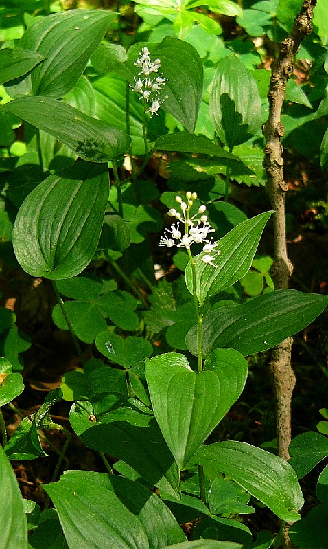 (Einkeimblättrige!), ganzrandig, kahl Blüten klein, mit 4 zurückgeschlagenen Blütenblättern, Staubbeutel weit hervorragend > Schattenblümchen (Maianthemum)