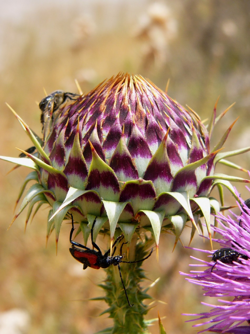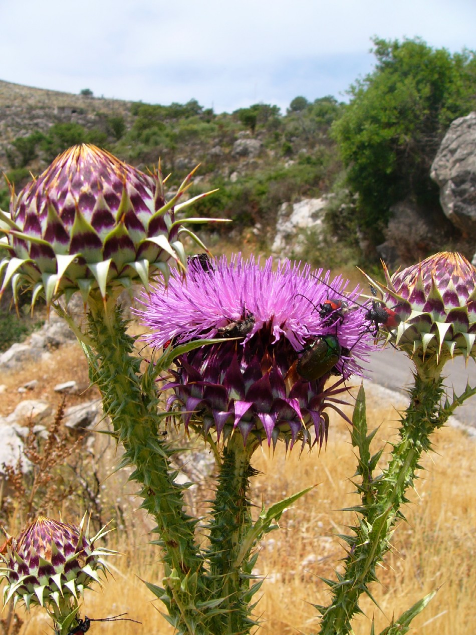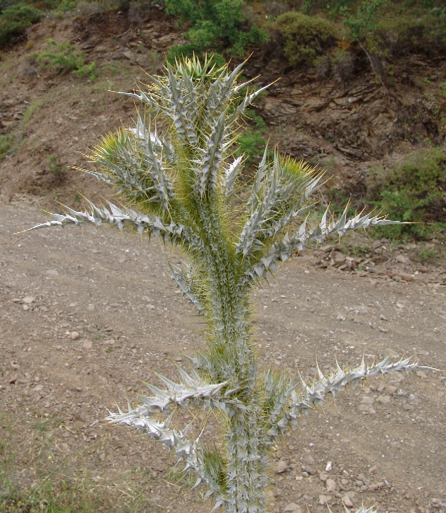 Verzweigungen enden mit 1 - 3 Köpfchen Köpfchen 5 - 7 cm breit, Blüten hellviolett, 3 - 4 cm lang Hüllblätter kahl, +/- dreieckig, 8 - 10 mm breit, mit bis zu 12 mm langem Dorn Stängel geflügelt, dicht mit Dornen besetzt, grau-