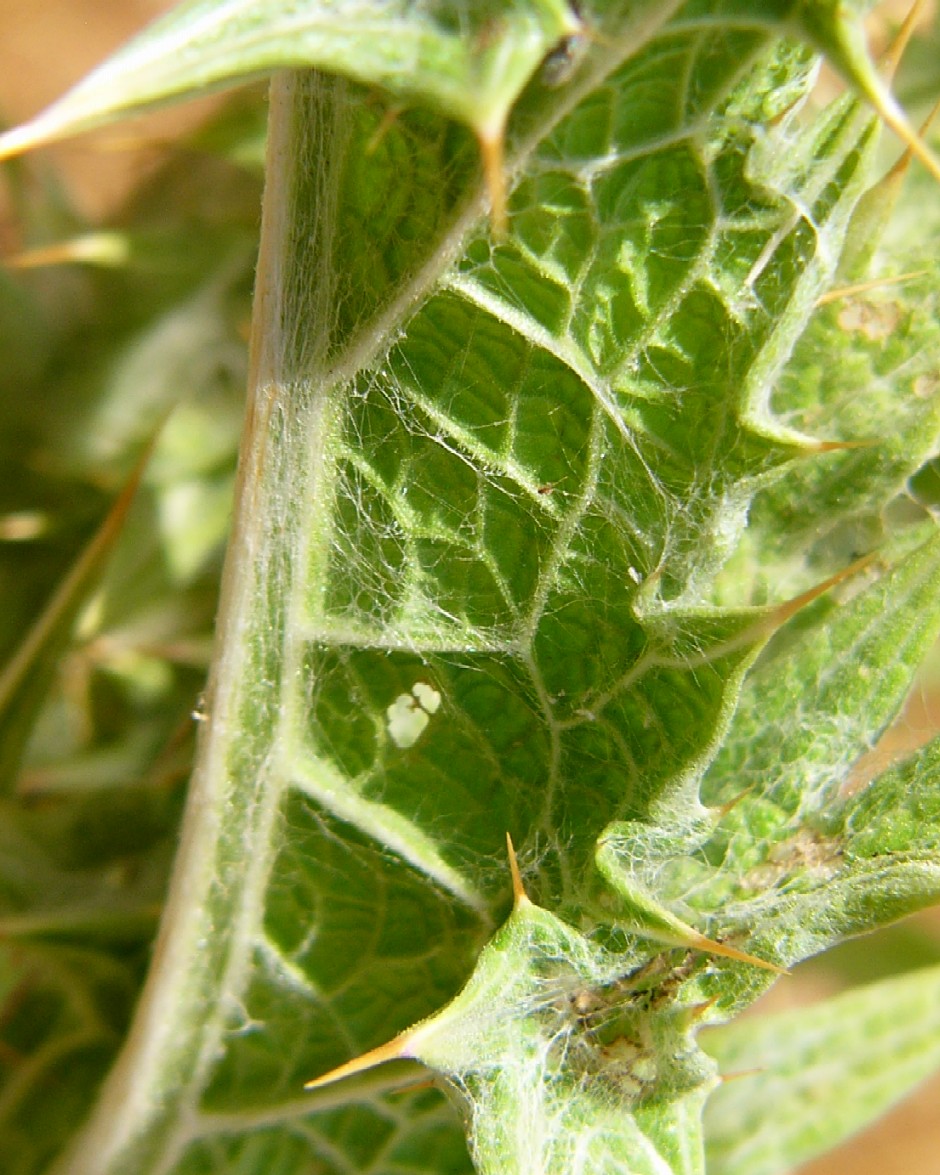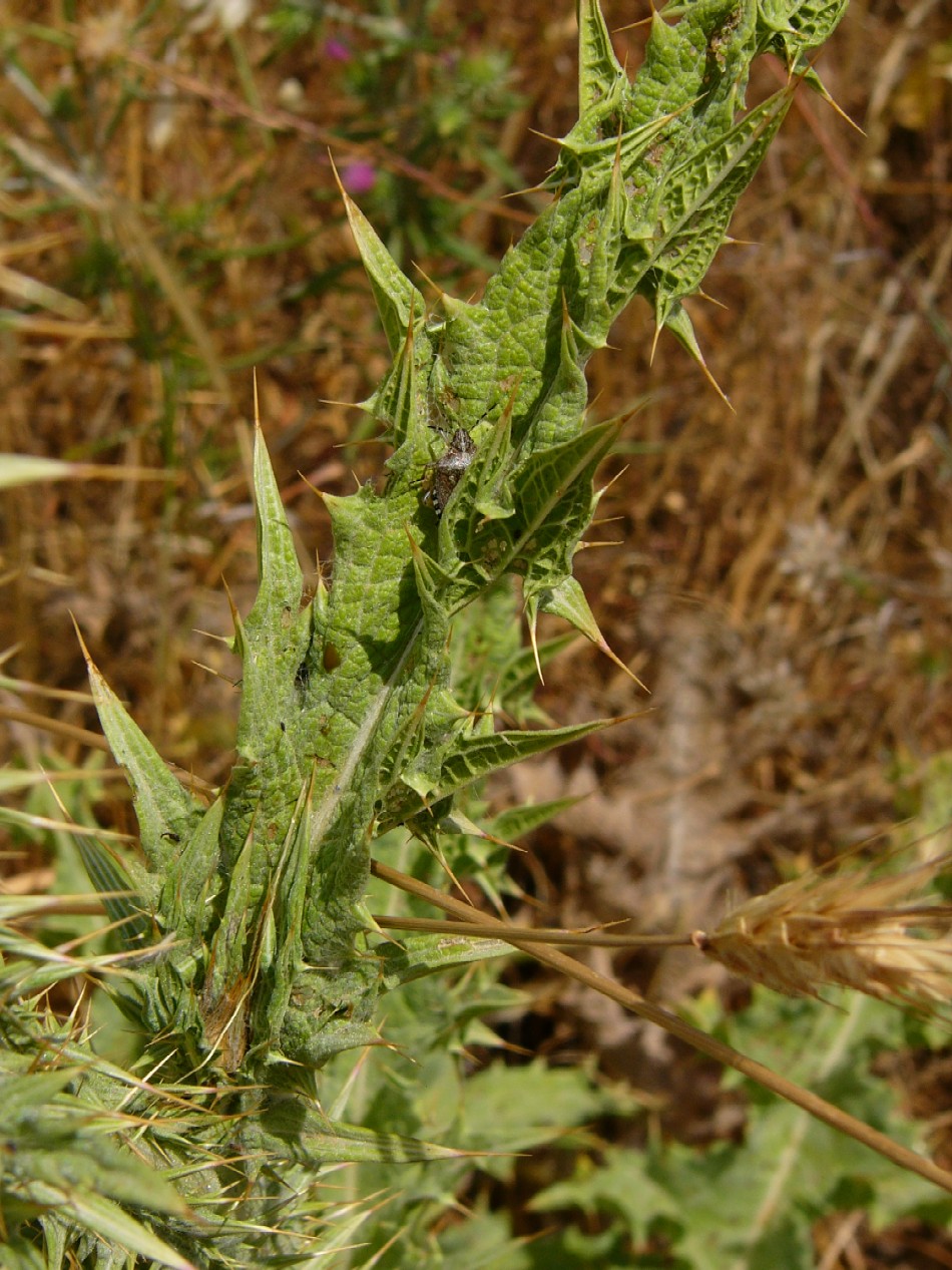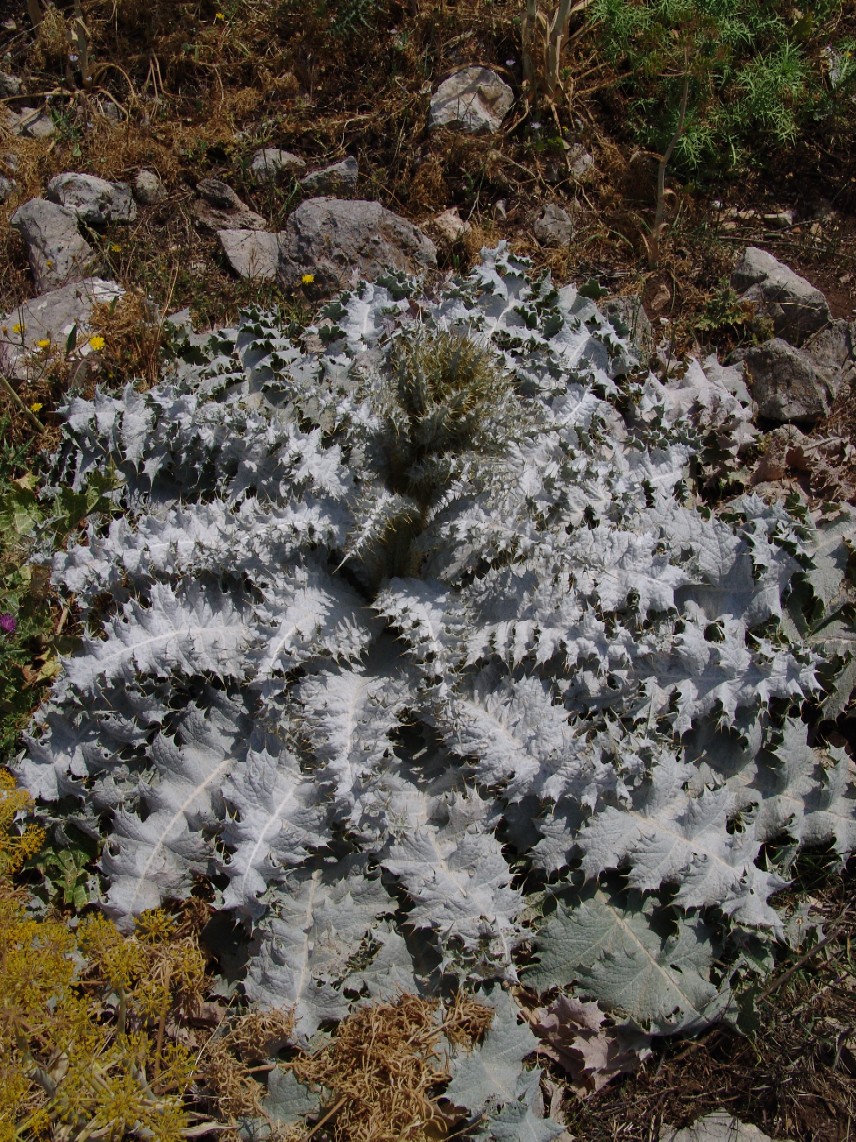 Endemit in Kreta Stängel bis 15 mm breit geflügelt, Dorn der Hüllblätter bis 12 mm lang Blätter ober- und unterseits weißfilzig > 3 |