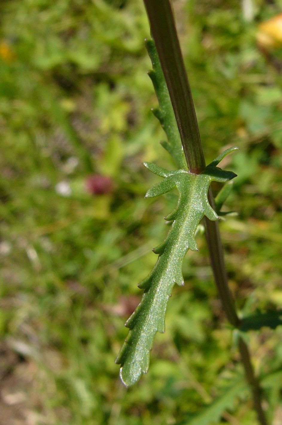 Obere Stängelblätter deutlich verkleinert, oft sehr schmal, meist scharf gesägt Mittlere Stängelblätter zerschlitzt erscheinend, auch im vorderen Teil eingeschnitten, unregelmäßig gezähnt, mit langen Zähnen Grundblätter mit rundlicher Spreite, abrupt in einen schmalen Stiel übergehend