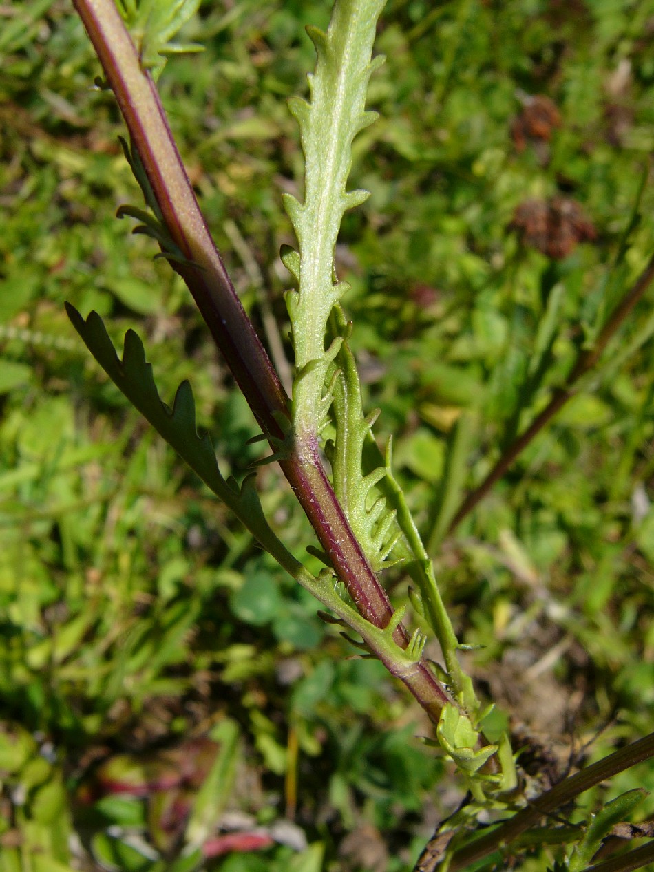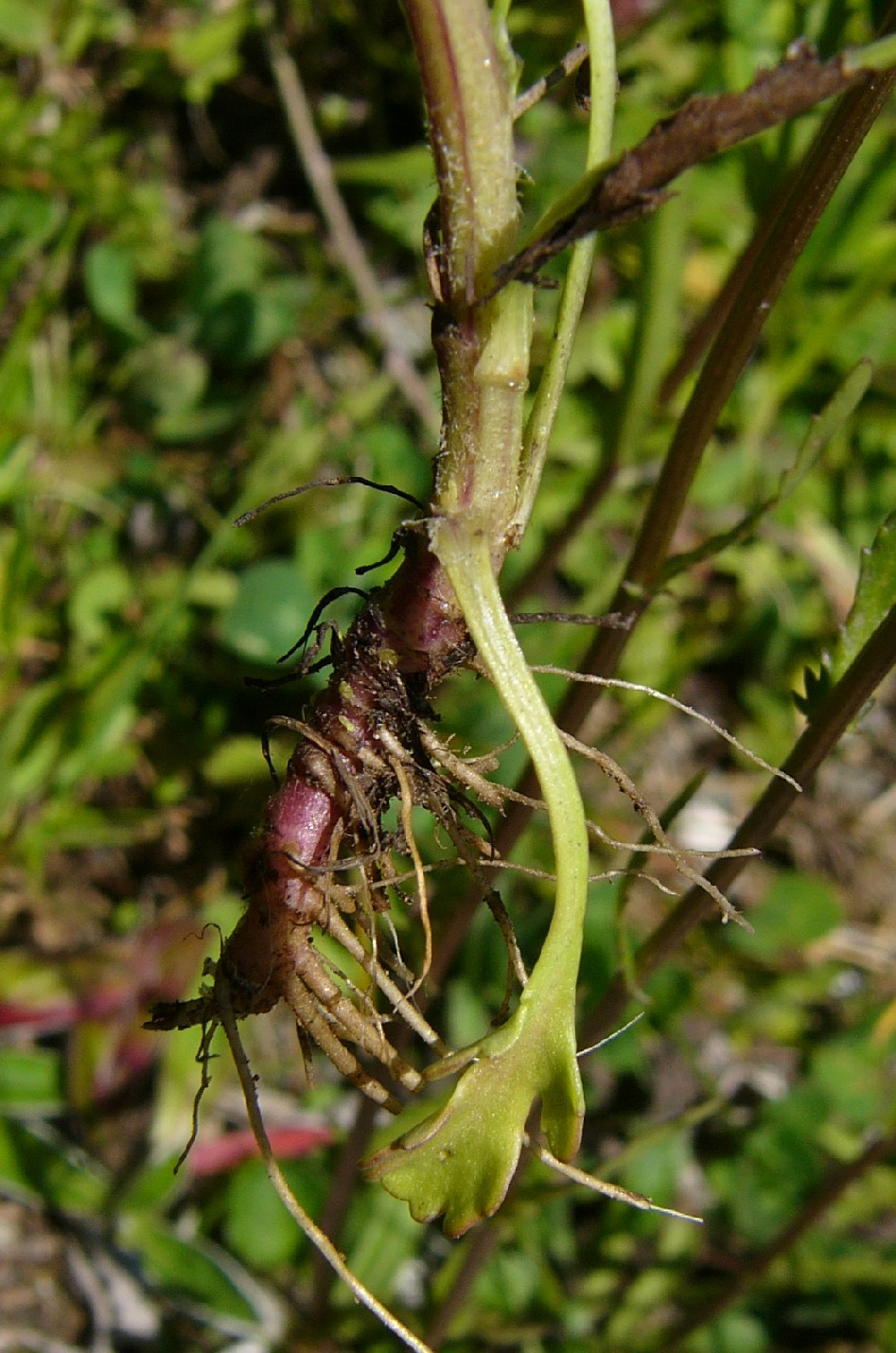 mit braunen Längslinien Mittlere Stängelblätter an der Basis verbreitert, den Stängel etwas umfassend, im unteren Drittel mit langen, paarig angelegten Zähnen, Zipfel viel länger als breit Grundblätter und untere Stängelblätter fleischig, kaum über 3 cm lang, gekerbt
