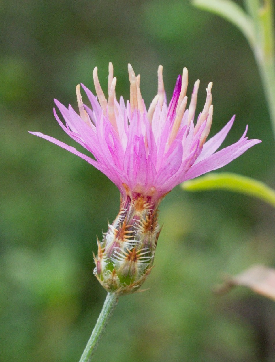 Pflanze 5 - 50 cm hoch, Blüten rosa Hülle 10 - 12 mm lang, 6 - 8 mm breit, Anhängsel braun, mit Öhrchen, die Hüllblätter verdeckend, Enddorn 3 - 4 mm lang, aufrecht oder abstehend Pappus ca. so lang wie die Früchte