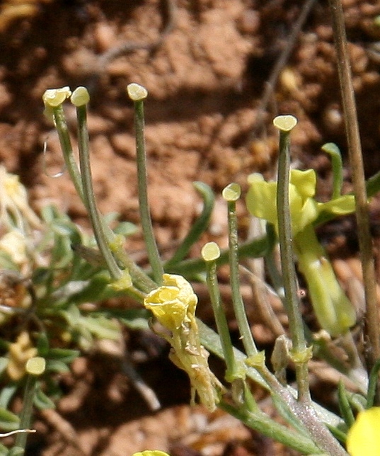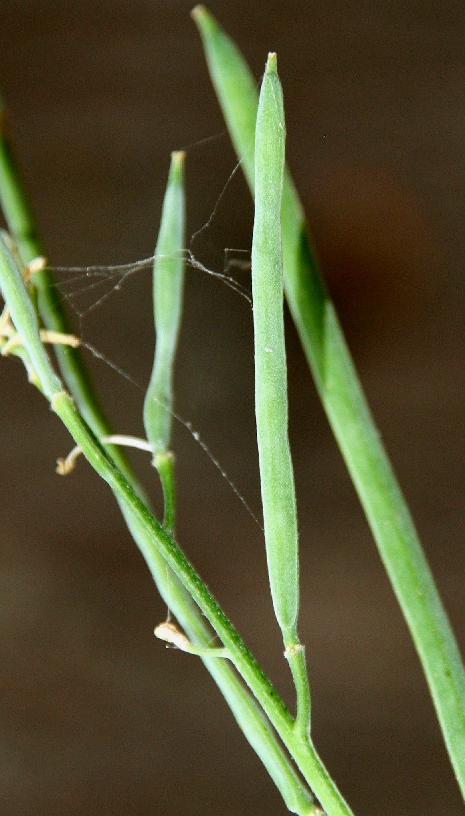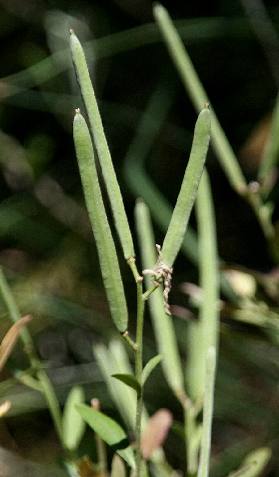 verholztem verzweigtem Stamm Blütenstand 10 - 20 blütig, Schoten 40 - 60 mm lang, 1 mm breit, in einem Winkel von 15 - 30° nach oben abstehend Stängel aufrecht, mit 5 - 15 Stängelblättern, am Grund verholzt