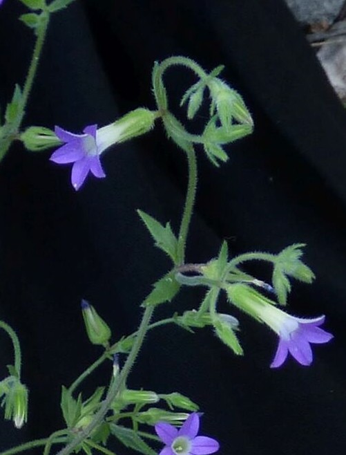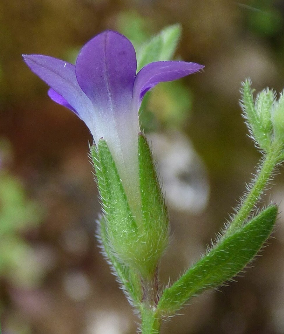 Blüten 8 - 10 mm lang, kurz gestielt, fast bis zur Hälfte in 4 - 5 mm lang, 2 mm breite, dunkelviolette Lappen geteilt, Kronröhre cremefarben, 4 - 5 mm breit
