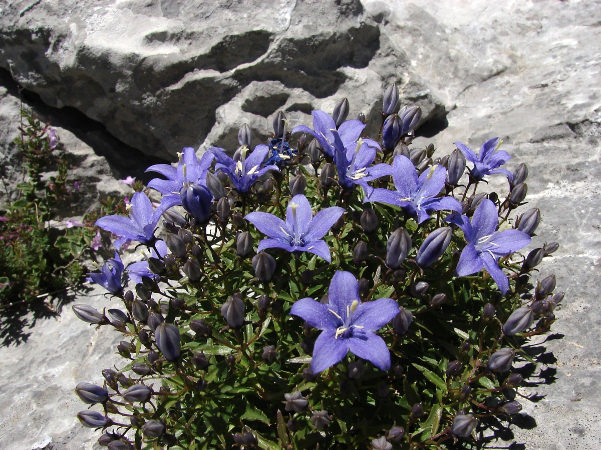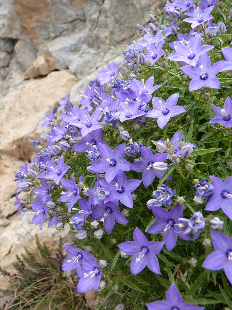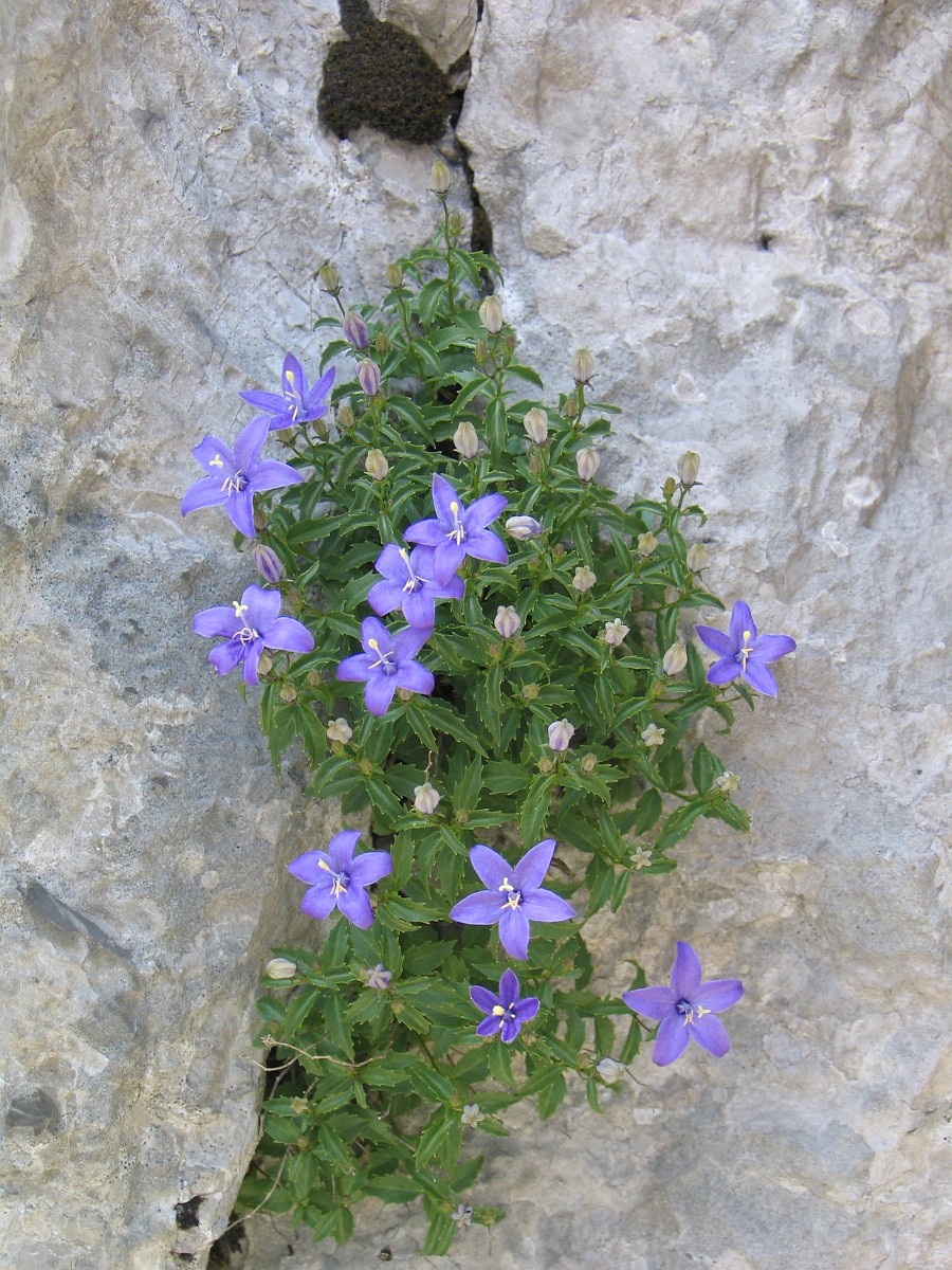 Campanula: Pflanze polsterförmig, Blüten in Rispen oder Trauben, blau/violett, schüsselförmig, Kronzipfel spitz, Griffel mit 3 Narben, mittlere Stängelblätter eiförmig, ganzrandig oder gezähnt