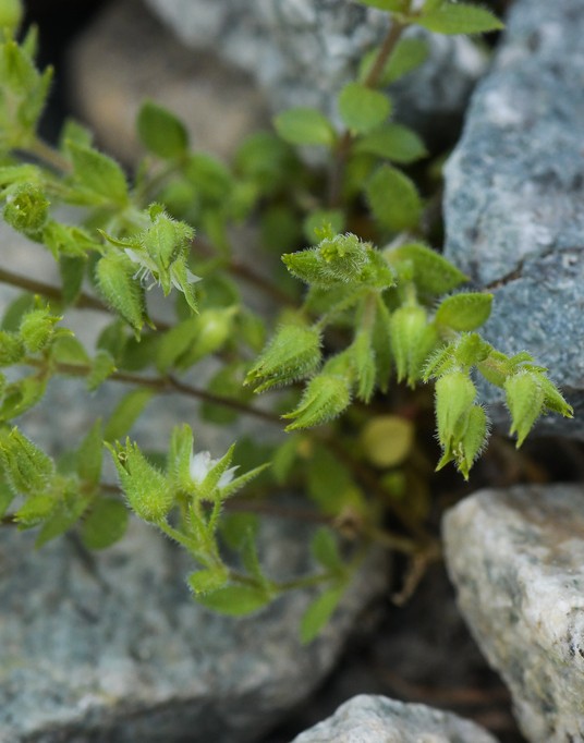 Blätter 3 - 4 mm lang, 1,5 mm breit, eiförmig, spitz, langhaarig