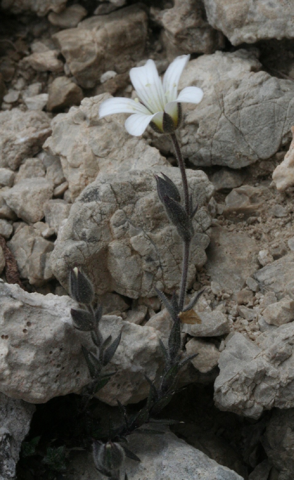 Blütenstand meist mit 2 - 4 Blüten, Blütenstiele mit 0,2 - 0,4 mm langen Drüsenhaaren, zur Fruchtzeit bis 10 mm lang, Blüten weiß, Kronblätter 5 - 10 mm lang, vorne abgerundet, länger als die Kelchblätter, Kelchblätter eilanzettlich 3,5 - 4,5 mm lang, dicht drüsig langhaarig