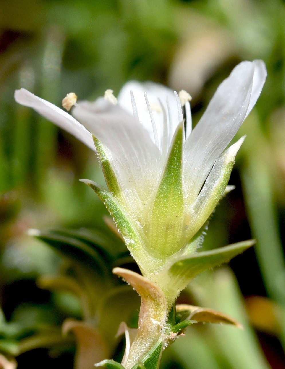 Blüten weiß, zwittrig, einzeln oder zu 2 - 4, sitzend, 5 Kronblätter, 5 Kelchblättern, Tragblätter kürzer als die Blüten, Kronblätter 6 - 10 mm lang, stumpf, abgerundet, länger als der Kelch
