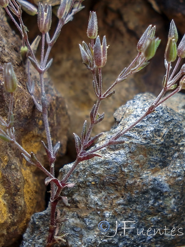 Blüten weiß, sternförmig, Kronblätter 4 mm lang, schmal, wenig länger die Kelchblätter, nicht deckend, Staubblätter ca. so lang wie der Kelch, Antheren 0,5 mm