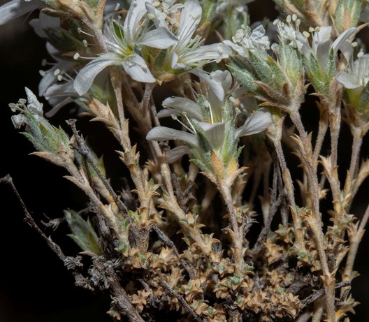 | Verbreitung: Granada, Malaga Blütenstand flockig filzig behaart, Obere Blätter stachelspitzig, untere Blätter stumpf, 1 - 1,5 mm lang > Arenaria delaguardiae
