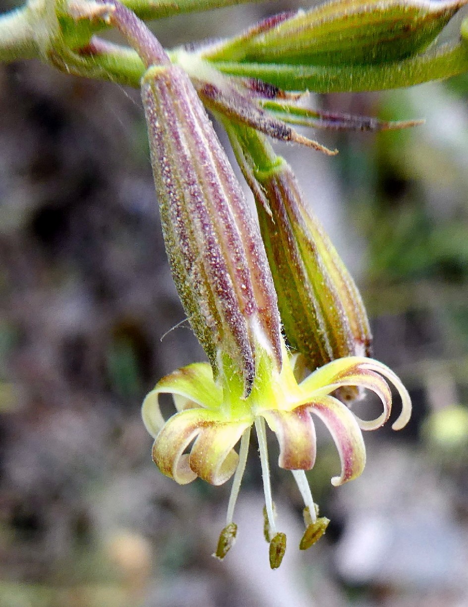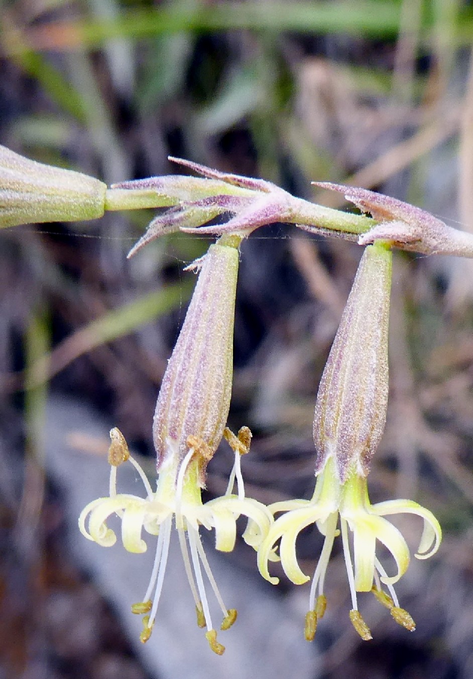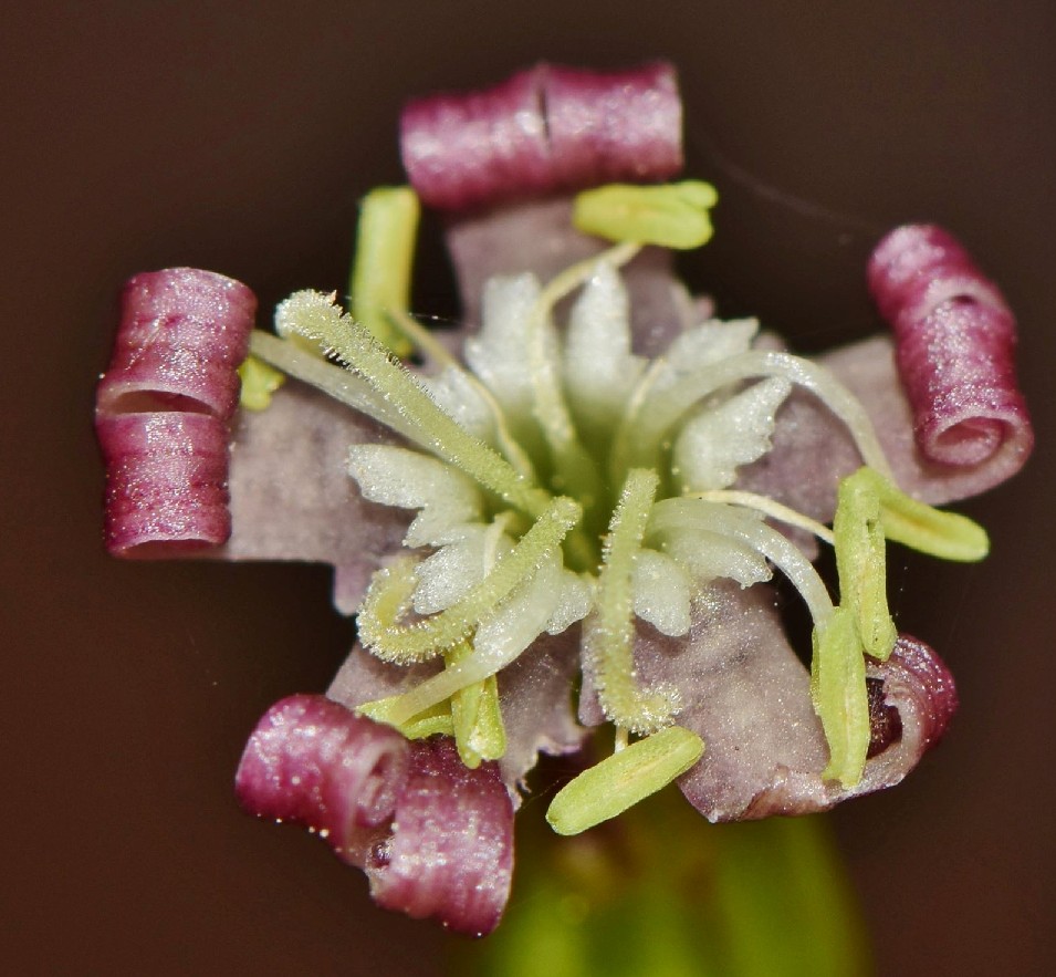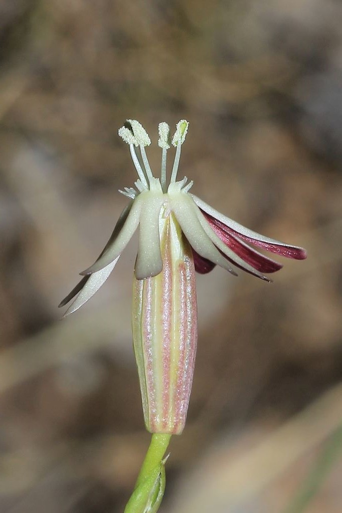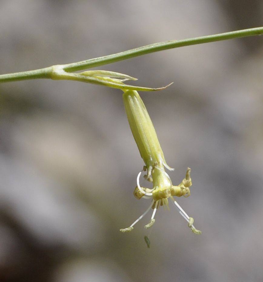 Blüten weiß oder grünlich, 5 Kronblätter, 10 Staubblätter, 3 Griffel, mit kleinem weißem Nebenkrönchen, Platte der Kronblätter 5 mm lang, bis zur Mitte eingeschnitten, Staubblätter aus der Kronröhre ragend, Kronröhre nicht länger als der Kelch, Filamente am Grund behaart