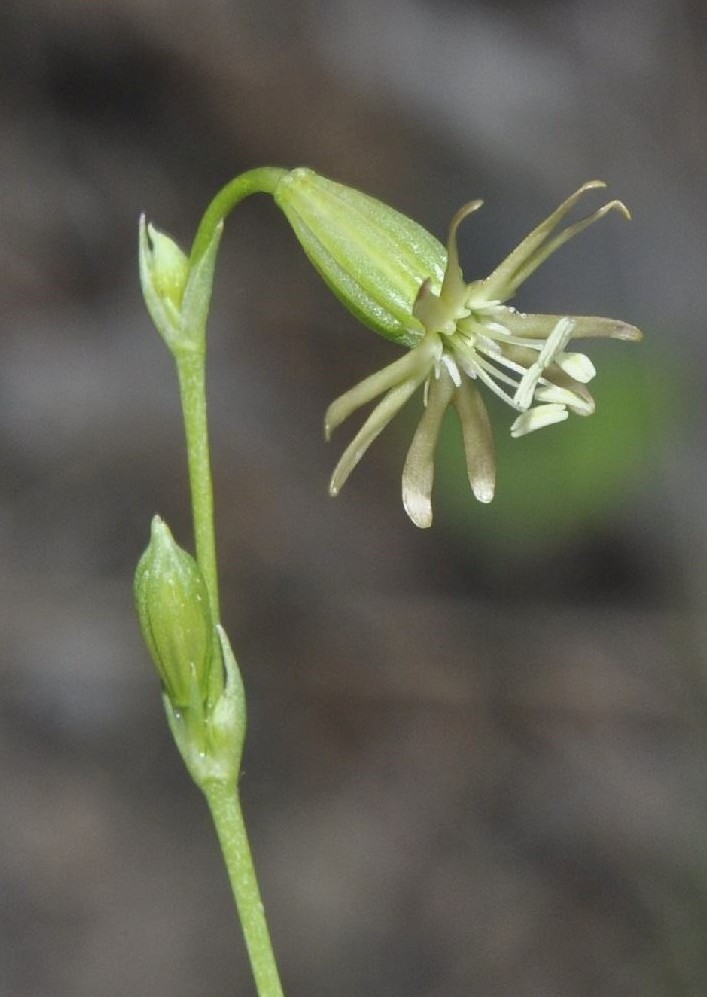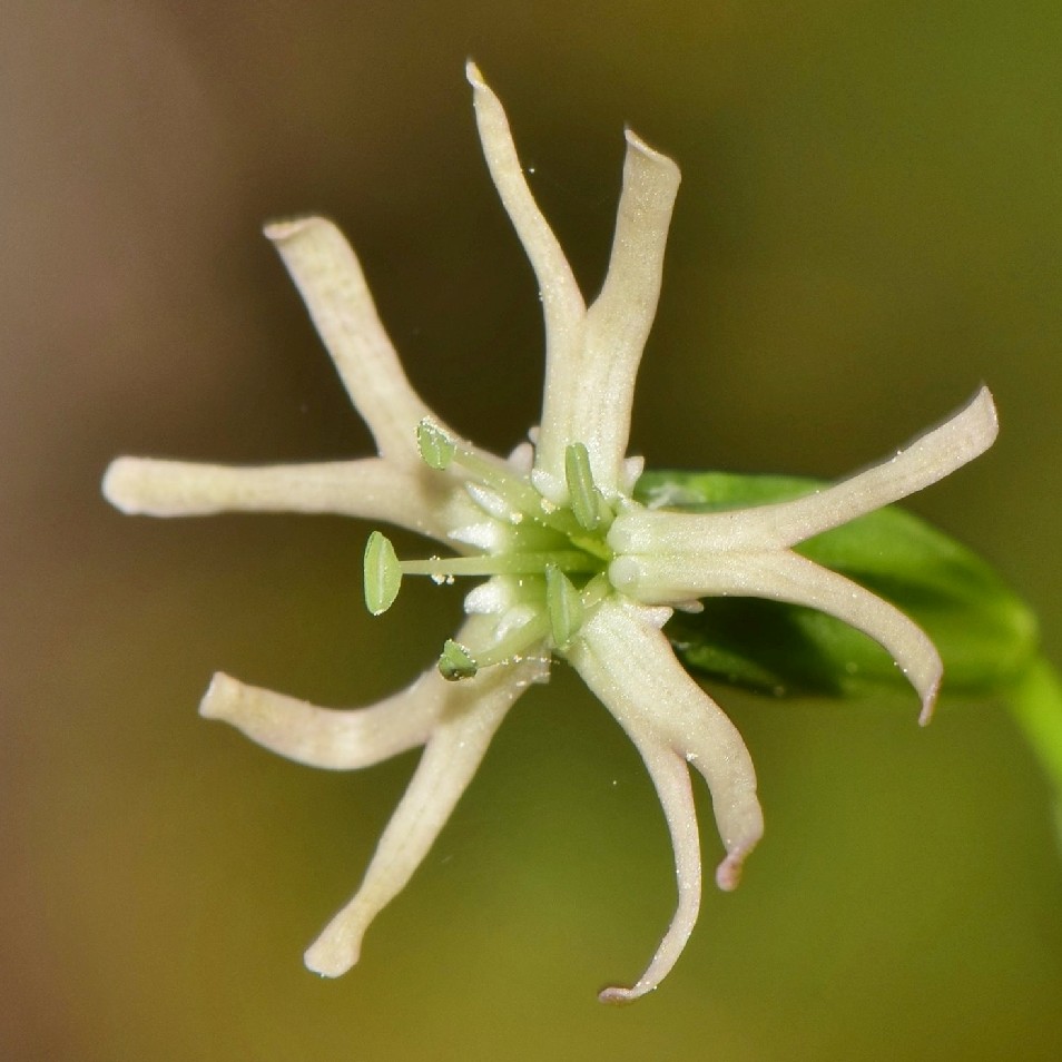 Blüten weiß oder grünlich, 5 Kronblätter, 10 Staubblätter, 3 Griffel, mit kleinem weißem Nebenkrönchen, Platte der Kronblätter 6 - 8 mm lang, fast bis zum Grund eingeschnitten, Staubblätter aus der Kronröhre ragend, Filamente am Grund behaart