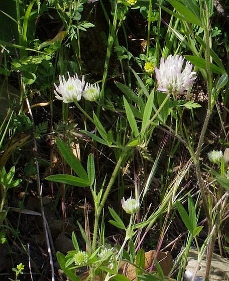 Trifolium - Blütenstand vielblütig, kugelig, gestielt, Blüten weiß oder rosa, deutlich länger als der Kelch, Kelch nicht aufgeblasen, Kelchzähne pfriemlich, oberste Blätter gegenständig, behaart