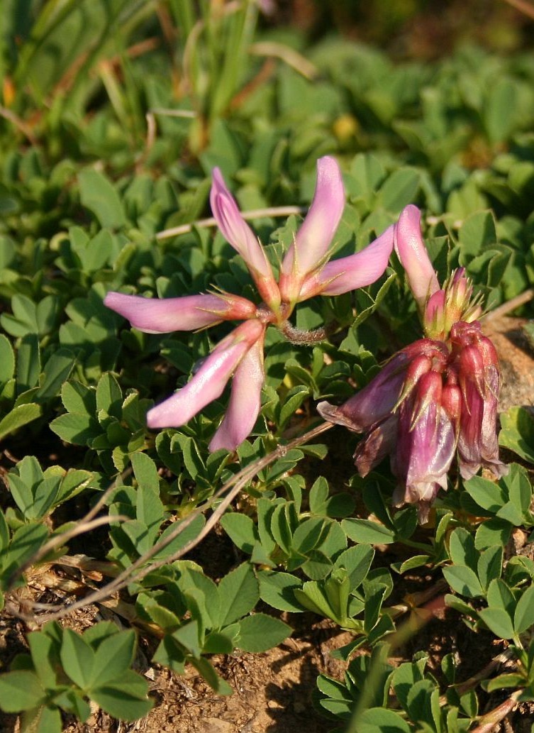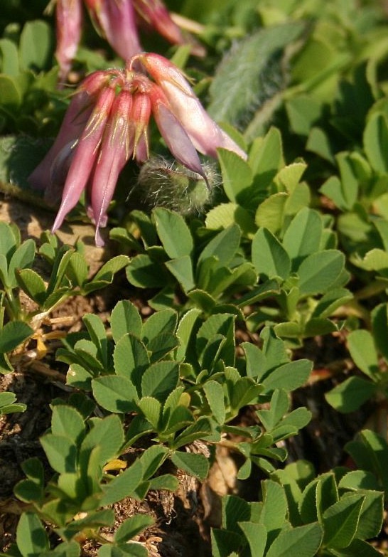 8 Blüten, Blüten rotviolett, 12 - 14 mm groß, kurz gestielt Nebenblätter ca. 7 mm lang, Blätter 3- teilig, alle grundständig