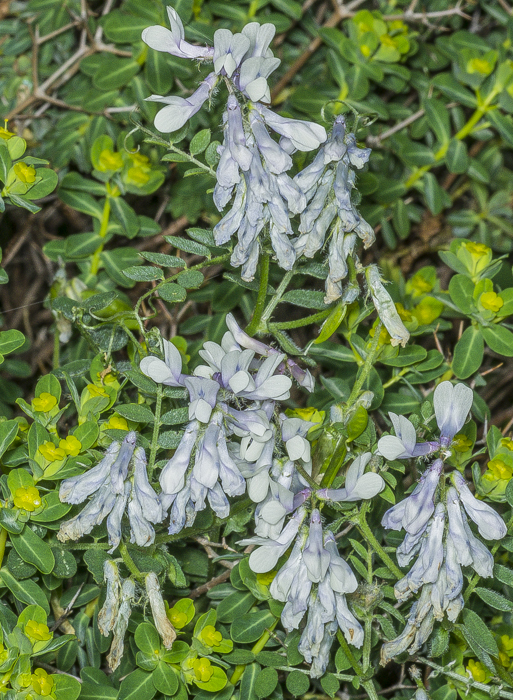 Blüten weißlich oder hellblau, Fahne 12 - 15 mm, kahl, ca. so lang wie die Flügel, Schiffchen weiß, an Spitze schwarzviolett, Blütenstiele 1 - 1,4 mm lang, Griffel seitlich zusammengedrückt, im oberen Drittel bärtig behaart, Staubblattröhre aus 9 Staubblättern + 1 freies Staubblatt