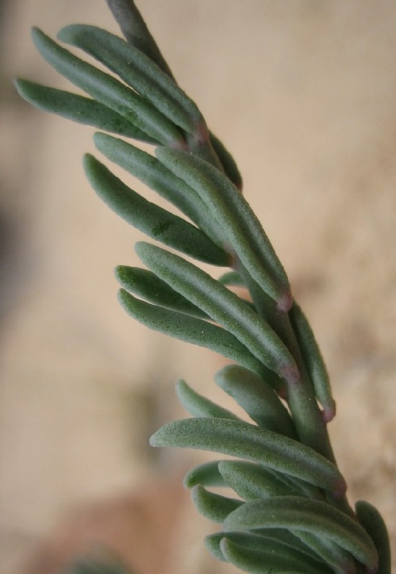 Blätter der fertilen Spross linealisch, 4 - 12 mm lang, 0,5 - 1,2 mm breit, kahl, die oberen wechsel- oder gegenständig, die unteren in Quirlen zu 3 - 5